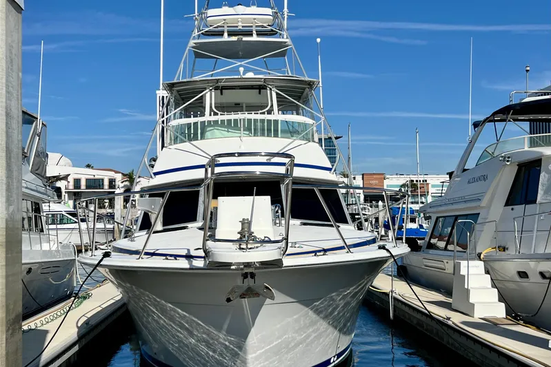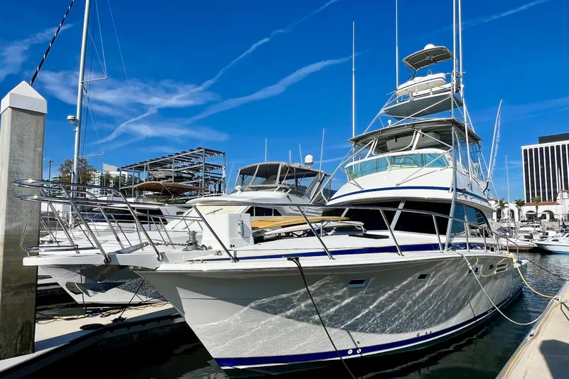 Live Wire is a 1982 Bertram 46 Convertible. A sportfishing yacht renowned for its exceptional seakeeping abilities thanks to a Deep-V hull that excels in rough waters, providing precise handling and stability even in challenging conditions. It's rugged fiberglass construction and wide beam contribute to impressive durability and performance. Powered with upgraded twin Detroit Diesel engines (570hp each) making her a "wave crusher" favored by tournament anglers. The boat's classic styling, efficient fuel burn and ability to stay on plane at lower speeds further enhance her appeal for both serious fishing and leisurely cruising.