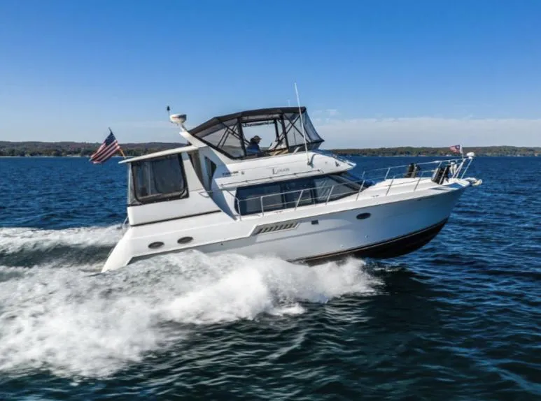 The Carver 406 Aft Carver (called the Carver in 1999-2022) is a heavily built double cabin motoryacht with an appealing blend of space, comfort and value. She's actually a repackaged version of Carver's earlier 370 Aft Cabin (1990-96) with slightly updated styling and a new intergrated swim platform. Below, the comfortable galley-down interior of the Carver 406 features a spacious main salon with an L-shaped Flexsteel sofa to port . A serving counter overlooks a well lit galley with Corian counters, hardwood flooring, and a full size refrigerator. The master stateroom has an offset queen berth, storage lockers, and private head with stall shower. The forward stateroom has an offset double berth and private access to the day head. A choice of light oak, cherry or maple interior wood accents were available. Wing doors and molded fiberglass steps provide easy access to the large swim platform. A good sea boat!