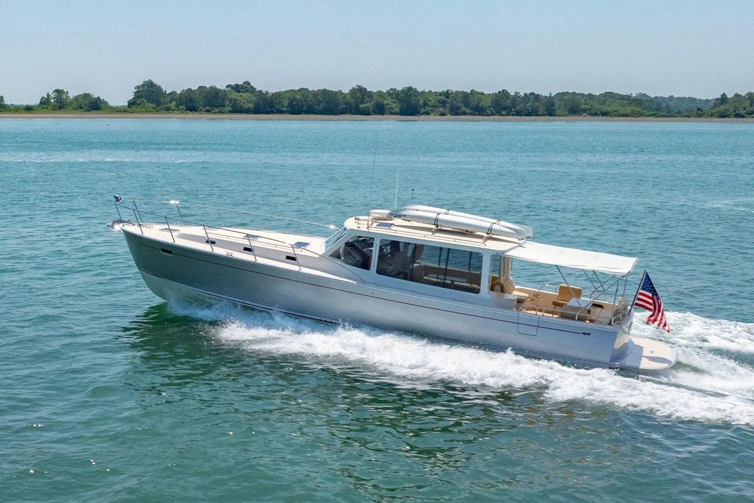 Her Moonglow Silver Awlcraft topsides, Esthec decks, and meticulously maintained cosmetics present as new. LOLA features a bright, thoughtfully designed interior with a forward stateroom, dual heads with enclosed showers, and a convertible guest cabin option. Natural light and ventilation flow through 16 opening ports and hatches, while abundant storage easily accommodates bikes, kayaks, golf clubs, and long-haul gear.