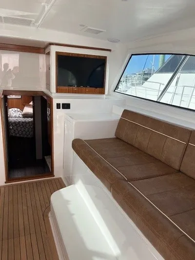 The Command Deck is both comfortable and functional, featuring upgraded air conditioning, a hard glass aft enclosure and a teak sole.  Up on the Flybridge, you'll find a three-sided enclosure and a Garmin Electronics Package by AME for state-of-the-art navigation.