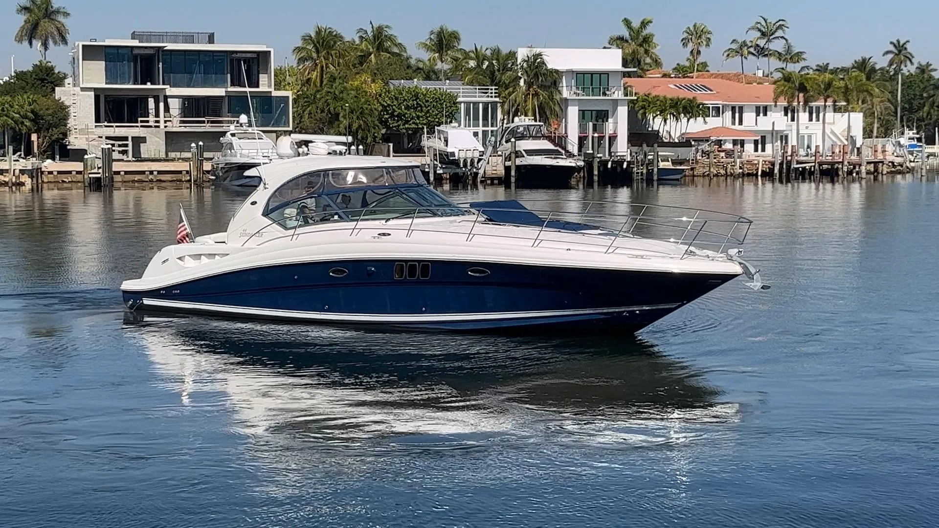 This Sea Ray 44 Sundancer is loaded with all the best options. Twin 5.9 425hp HO Cummins Diesels, Zeus Drives with Skyhook, Huge swim platform, Drop down TV in the salon, Air Conditioning, rod holders, underwater lights, premium audio upgrade, fiberglass hard top with full enclosures, air conditioner vents that blow onto the driver and co-pilot in the cockpit, wrap around seating in the cockpit, large fuel capacity 335 gallons (1,268 L) offers long range capabilities at a fast 24 knot cruising speed, 32 knots max, all in a deep V hull that has a very smooth flat ride. The Sea Ray 440 is one of the best Sundancer models and has earned an excellent reputation worldwide.