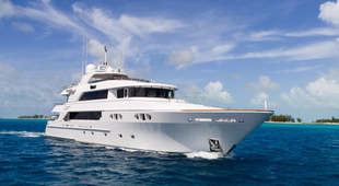 The flybridge, accessed from the forward port corner of the upper aft deck, has a half-moon shaped bar with four bar stools. Equipped with refrigerator and ice maker the bar wraps around the 60-jet hot tub built in under the arch section. An air-conditioned day head is conveniently located on this desk for ease of use by guests. Located aft, the large sun splashed area has 4 lounge chairs. Forward is a large sunpad with an additional large seating area facing forward with teak tables and custom umbrellas.