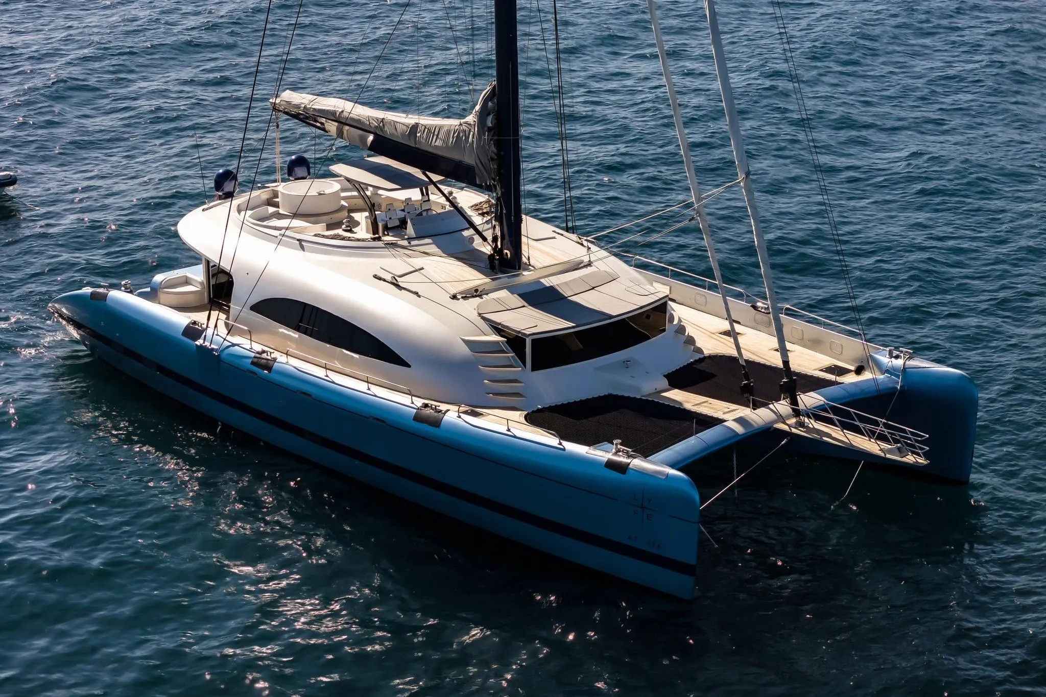 Built in 2014 and commissioned in 2017 by Magic Yachts Shipyard (builder for Wally, Cantieri di Pisa and others), LYFE AT SEA was constructed with an infused composite shell of fiberglass and carbon, reinforced by a Kevlar hull. This unique maxi catamaran is equipped with premium features including a hydraulic swim platform, Jacuzzi on the flybridge, and state-of-the-art entertainment systems.