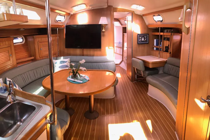 "Makani" is a traditional 2 stateroom / pullman layout. Full "L" shaped galley to port of companionway with a large pantry aft and port. Adjacent to starboard is a "wet" head with access from salon and private aft stateroom with inline double berth, hanging locker and drawers. Moving forward you have a large U shape dinette midship to port with a table that drops down to convert to a double berth. To starboard is a "love seat" and Nav Station with a swing out chair. Moving forward is a Pullman queen berth with ample storage below the berth and adjacent to starboard with cedar hanging locker and drawers. Forward is a step in full head with separate shower. Forward of shower is a storage locker.