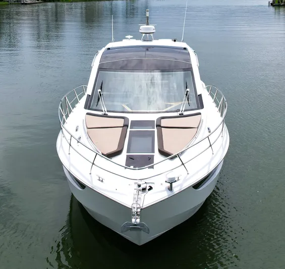 Bottom paint Bow deck rail, 316 stainless steel with side access Cleats, stainless steel 11.5” (6) Fiberglass engine room air intakes and stainless steel outputs Flooring, molded non-skid (bow and side deck) Handrails, 316 stainless steel (cockpit, side deck and sunpad) Hatch, foredeck square with integrated skylights Horn, electric Lights, navigation Mooring System • Reversible electric anchor winch • Anchor roller • Galvanized anchor, 44 LB (20 KG) with 197 FT (60 M) of 5/16” (8 MM) galvanized chain with leash protection • Fiberglass deck hatch to self-draining chain locker Rubrail, PVC with stainless steel insert Spotlight, remote-controlled Thru-hull fittings, stainless steel Windows, bonded tempered glass (hullside) with integrated opening rectangular portholes Windshield, tempered and tinted glass (bonded), single pane forward glass Windshield defroster
