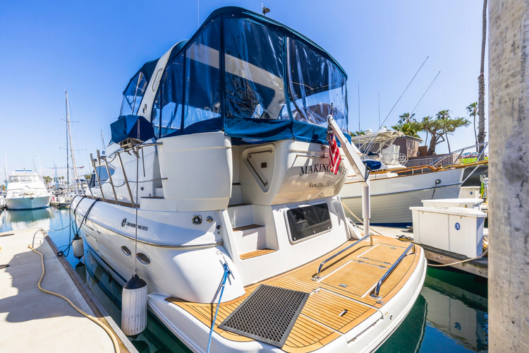 This boat offers three-stateroom interior with a large master aft-cabin. The master stateroom offers both privacy and luxury and features an island berth, walk-in closet, and a private head with a large bathtub and shower. Up to the salon, with an L-shaped settee on starboard with a fore and aft facing dinette forward of the settee. On port is an entertainment center aft with the U-shapped galley forward. A guest stateroom with a queen berth is located forward, and a third stateroom with two single berths is located amidships under the dinette. The cockpit provides comfortable seating associated with traditional express boats but eliminates the typical separation of guests between a bridge and aft deck. The cockpit includes a wetbar that has a refrigerator and sink, and a full enclosure that provides excellent wind and weather protection. There is 6’5” headroom throughout.