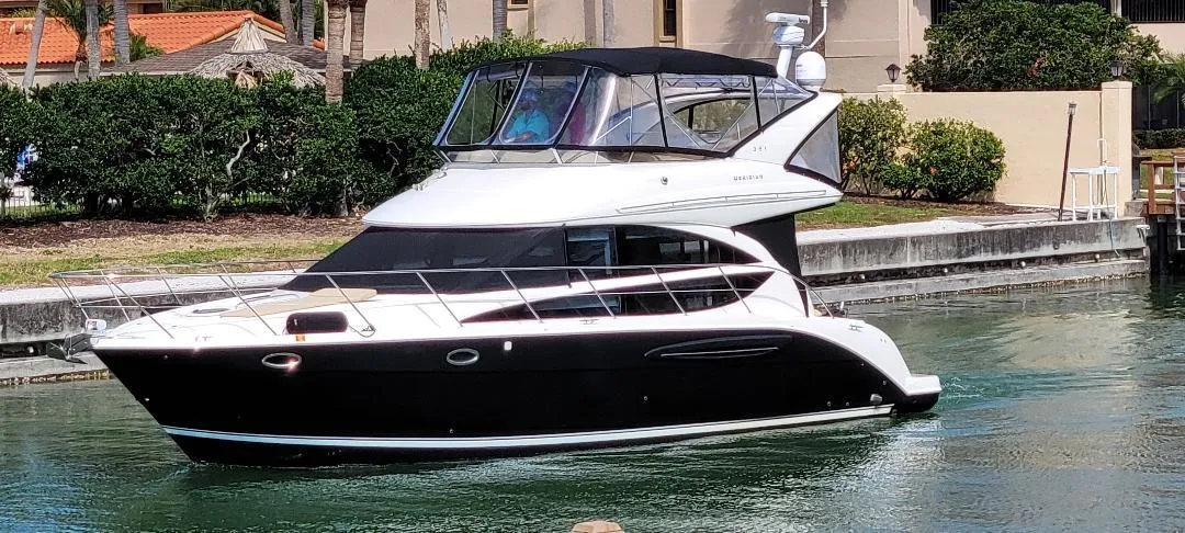 Check out this beautifully maintained Meridian 391 Sedan. Recently all of the Canvas and Isinglass has been replaced, exterior cushions have been recently reupholstered with high grade marine fabric. A itemized list of all maintenance, pest and termite treatments and other upgrades are available. The Meridian 391s are so popular due to their luxurious interior appointments and open salon floorplan that it makes for great entertaining with your guests. It's lower level cabin has 2 staterooms and 1 head and full shower stall. Equipped with twin 450 hp Cummings diesel engines with just over 600 hours on them.
