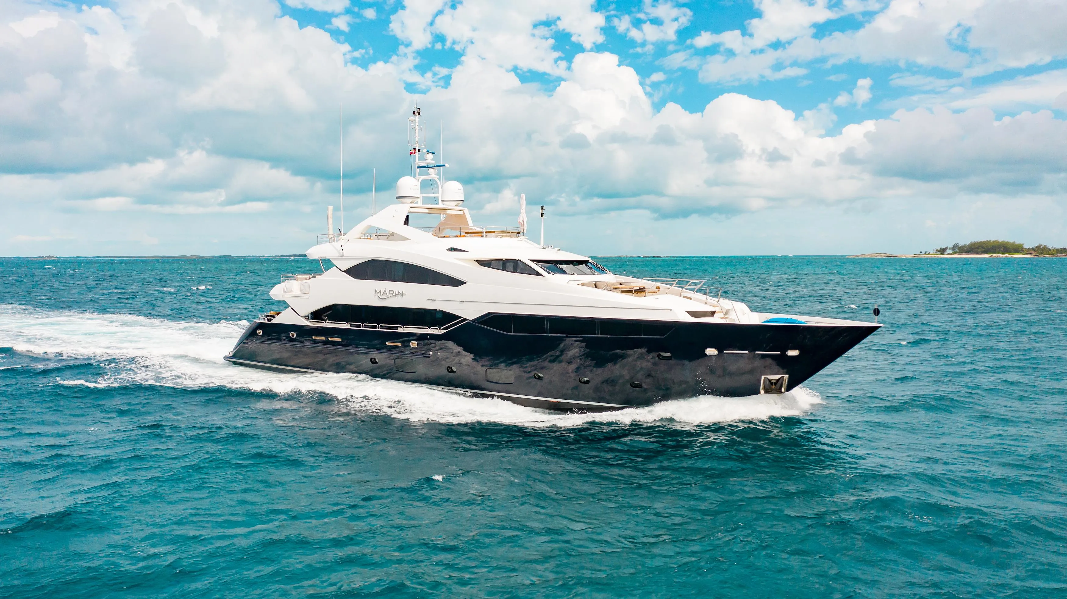 Currently finishing its 10 year class survey, the sporty yet sleek motor yacht MARIN is the idyllic vessel for those seeking a true oceanic experience. Built for outdoor enjoyment, she boasts numerous deck spaces that each serve a different purpose. Both forward and aft, each designated area offers guests varying opportunities for either intimate gathering, exquisite dining experiences, panoramic sunbathing, and entertaining.