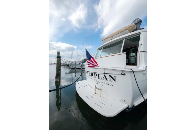 Main deck features enclosed sundeck with sliding glass opening windows aft of the main salon. Galley up across from the guest day head to starboard. Luxurious master stateroom down and aft with spacious head and shower. Rich classic Hatteras dark woods throughout salon and staterooms. Lower helm forward of main salon has deck access doors to both sides and steps to flybridge and down to guest staterooms. Lighted steps carry you down to the forward v-berth w/ separate head. There is a mid-cabin with two berths and guest head across a companionway from additional refrigeration, storage, laundry, and finally aft is access to the standup engine room. Reverse cycle marine heat/air conditioners throughout.