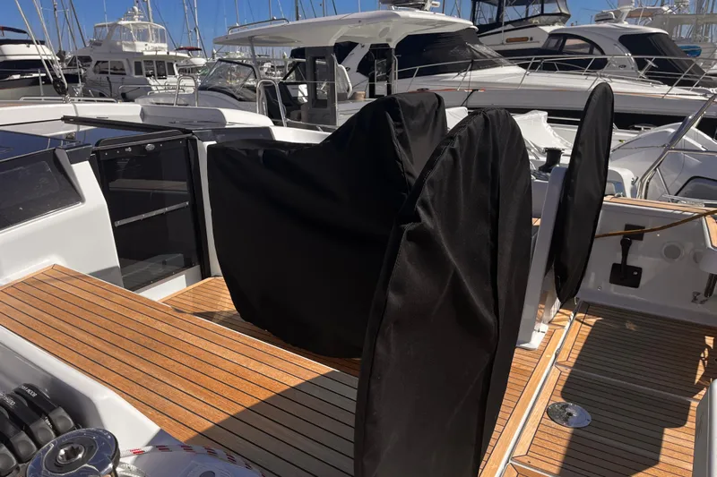 - Covered halyards and control lines lead to cockpit helm position, organizers and jammers, 4 mooring cleats, handrail on coach roof, bow anchor fitting with teak step