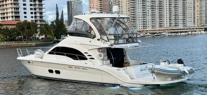 The Sea Ray 52 Sedan Bridge is so beautifully designed and fully equipped, it's virtually in a class all its own. Outfitted with a fiberglass hardtop, Isenglass enclosure and optional bridge air conditioning, this impressive yacht demands attention wherever it goes. Elegant features include wood flooring, fully adjustable thigh-rise helm seating, master and port staterooms with flatscreen TVs and two full head compartments with separate showers.