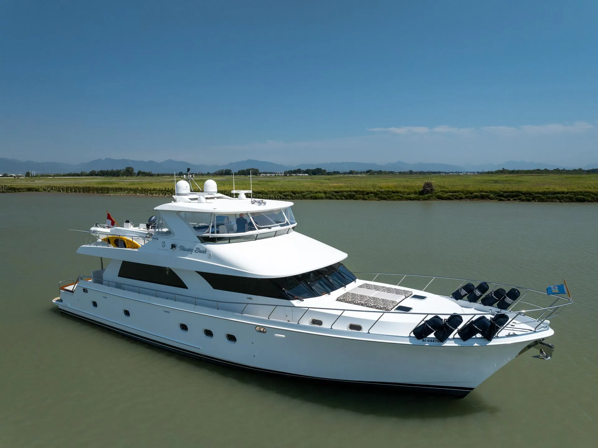 "MEMORY BANK's" generous 20 foot beam creates usable side decks and a spacious interior, richly accented with teak throughout. Cabinetry, joinery, bull noses and soles are all notable for an impeccable finish. Her massive flying bridge offers generous space for entertaining or a comfortable area to lounge on a sunny afternoon.