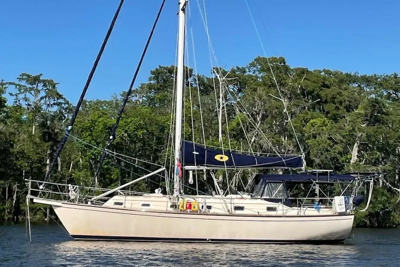 The COCKPIT is large and comfortable with cockpit seats and cushions that are easily long and high enough for lounging or sleeping. The Helm features a comfortable helmseat at the wheel with the nav equipment and instruments within easy access. The recently installed custom canvas and Bimini with sun/wind screens makes for a very comfortable outdoor living space. There is a built-in hand-held hot water shower. Additionally, there is plenty of storage including a cockpit ice box, large lazarette, cubbies and shallow locker.
