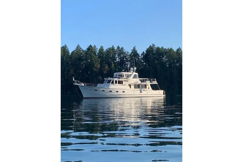 55 Fleming Pilothouse. She has benefitted from having an extremely knowledgeable owner. She is powered by a pair of low hour Cummins 450 diesels, which are kept and maintained in immaculate condition. She is set up for cruising the pacific northwest, Reverse cycle heat/AC ,full size washer and dryer, bow and stern thrusters, new Garmin complete navigation suite, watermaker, new lithium battery banks with mastervolt chargers inverters. New Full size refer. Mareton monitoring system, New electronic controls, Starlink. She has the extended boat deck allowing for a large newer 12 Walker Bay tender. Steelhead 1000lbs fully hydraulic davit, Full flybridge Hardtop enclosure, new upholstery, pop up flat screen tv, she shows in nearly Bristol condition and is truly turn key. Owners moving up to a larger Fleming. Covered condo slip available to purchase. Vessel is in a Washington state tax paid LLC.