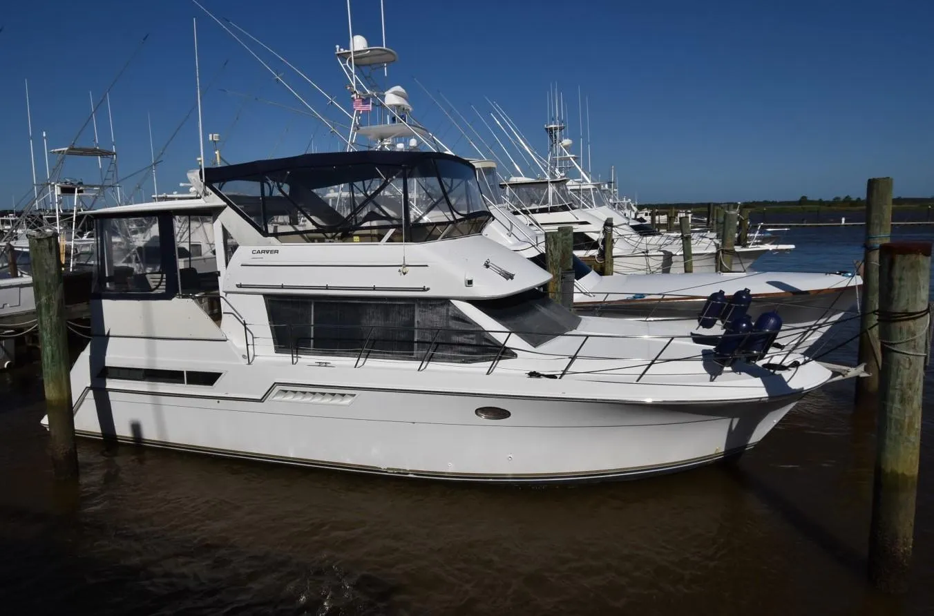 Introducing the stunning 1997 Carver 405 Aft Cabin Motoryacht, a remarkable vessel that combines elegance and performance. With an overall length of 42.25 feet, this motoryacht features a robust fiberglass hull with a Deep Vee shape, ensuring a smooth and stable ride on the water. Powered by twin Cummins 6BT inboard engines, each delivering 315 horsepower, this yacht offers impressive performance with a cruising speed of 21 knots and a maximum hull speed of 24 knots. With only 800 hours on the engines, it promises reliability for your adventures. The Carver 405 is designed for comfort and functionality, making it an ideal choice for both relaxation and exploration. Its thoughtful layout and quality craftsmanship make it a standout option for those seeking a luxurious boating experience. Embrace the open waters with the Miss Dot, where every journey becomes a memorable escape.