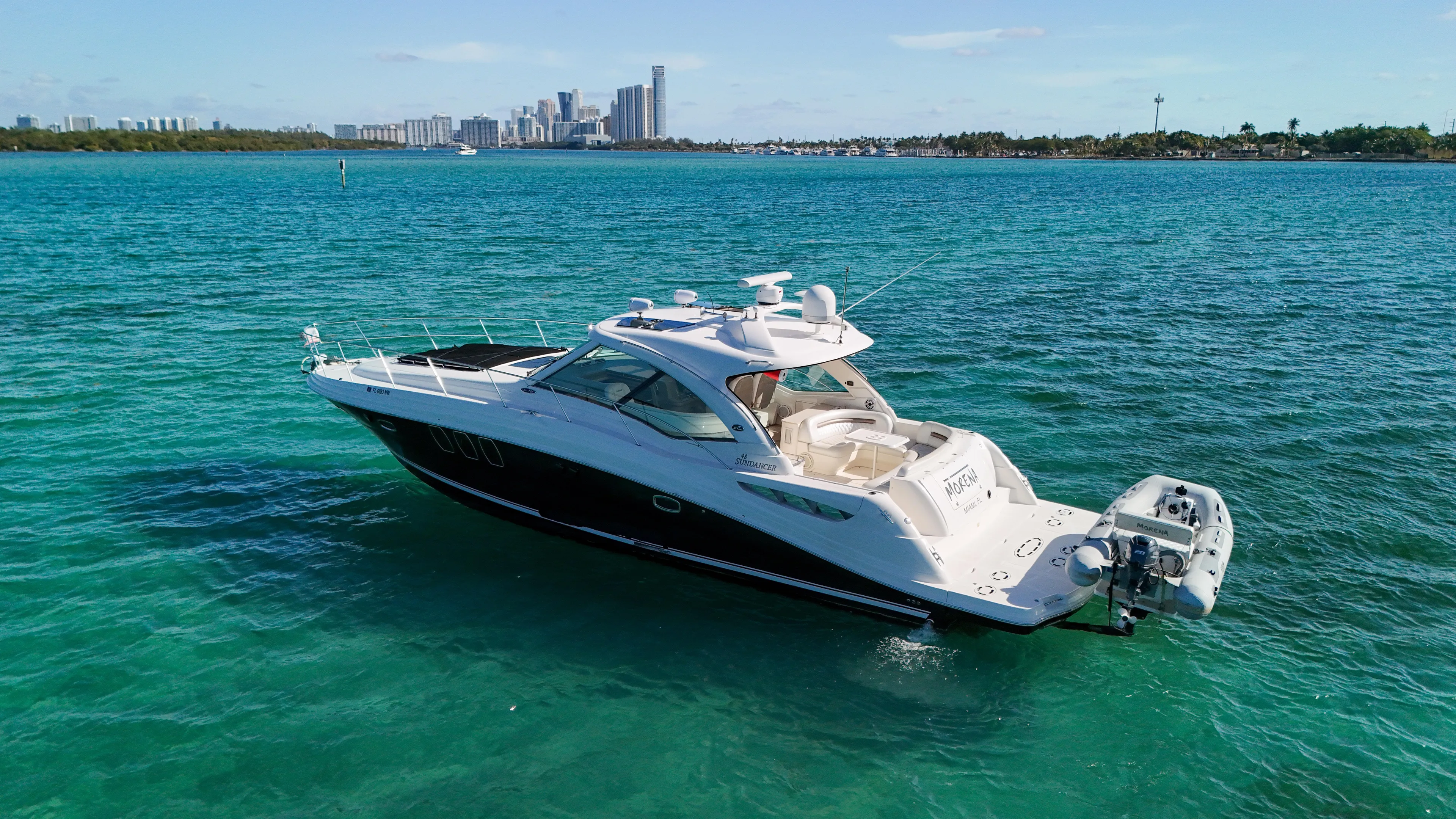 The Sea Ray 48 Sundancer is visually stunning, with sleek, modern lines that convey both sophistication and speed. Measuring 48 feet in length and boasting a 14-foot beam, it provides an optimal balance between spaciousness and agility. The hull's graceful curve and expansive windows create a striking profile, while the gel coat finish ensures durability and a showroom shine.
