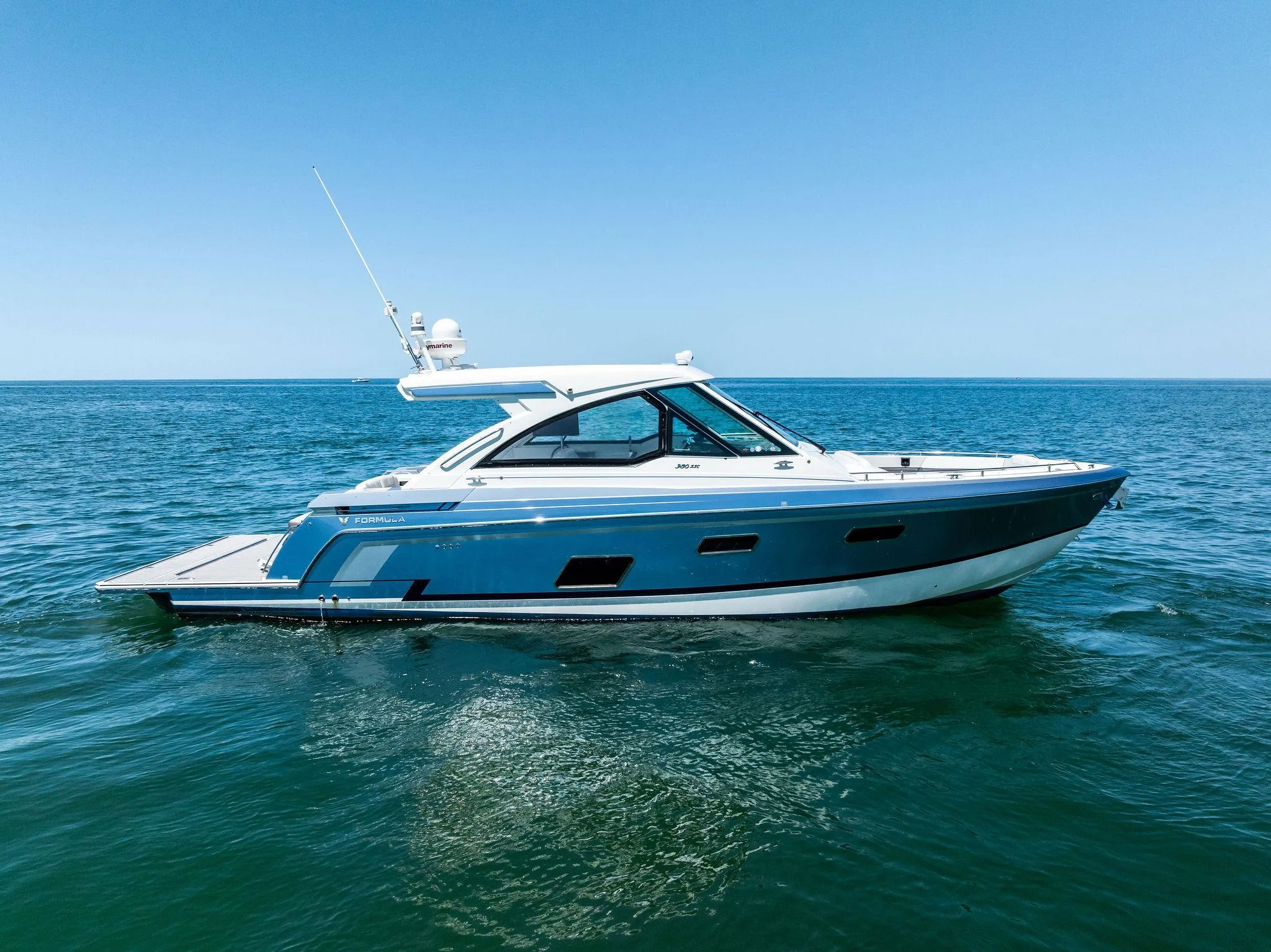 2021 Formula 380 Super Sport Crossover " MOTORBOATIN’ " for sale. Elevate your boating experience with this lightly used and well-maintained 2021 Formula 380 SSC. She is powered by twin Mercury Racing 520HP engines with only 40 hours and equipped with Mercury Joystick Piloting for outstanding control. Further enhancements include a Seakeeper 3 for a stable boating experience and a FLIR thermal camera for added safety. The 380 SSC is built on the iconic FAS3Tech multi-step hull which delivers great handling and impressive fuel economy. This well-designed Crossover is a perfect combination of a family fun day boat and a weekend cruiser. The bow area has seating for 6 with tables or easily converts to a sun lounge. The cockpit has a hardtop coupled with removable isinglass panels on port and starboard and is climate-controlled (dedicated reverse cycle air conditioning) at the helm and seating area. An outdoor kitchen further compliments this space and social zone. Even more shade can be provided by the optional electric aft sunshade that covers the whole aft end of the boat. Below you will find a galley that's perfect for lunches and snacks. There's also a convertible dinette, double bed, and full head with shower. The Formula 380SSC sleeps 4 in the cabin boasting a 6’ 3” head height. MOTORBOATIN’ is a low-hour, highly optioned, single owner vessel and she is seriously for sale.