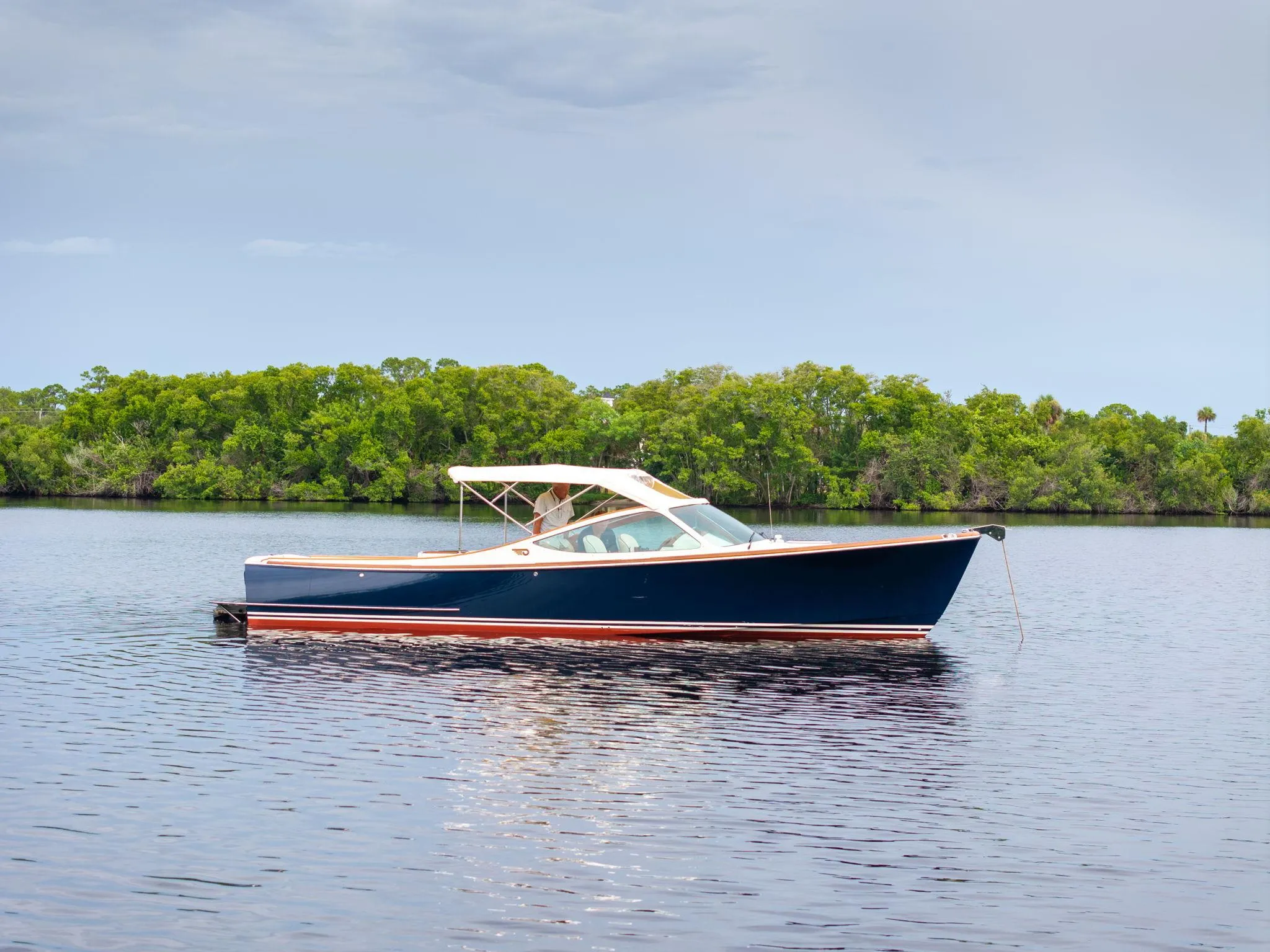 • Rounded, tapered, varnished teak toe rail with Hinckley profile.