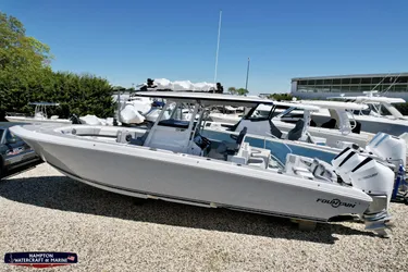 FEATURES: Kingston Grey Hullside + Underside Hardtop Gelcoat, Bottom + transom gel coat (White), evening blue metallic boot stripe + hardtop permitter lip, white rub rail, trim tabs, underwater lights, reverso engine flush system, transom shower, transom door, freshwater washdown, raw water washdown, marine mat-Hex (Grey), Light Grey Seat base upholstery w/ White, charcoal, light grey & blue accents, stern seat w/ armrests, stbd dive door, gunwale coaming bolsters, aft facing seat w/ (5) integrated cup holders, white powder-coated T-Top Frame, helm seat w/ flip-up bolsters, leather-wrapped steering wheel, Ceramic toilet w/ ob discharge, freshwater sink, fwd console chaise lounge, bow seating w/ integrated back rest, drnk holders & storage underneath, 6 fender holders, thru-hull Windlass w/stainless plow anchor, bow thruster, Dock lines (6), Fenders (2), SOS flag, Fire extinguisher, Throw cushion, 6 life jackets