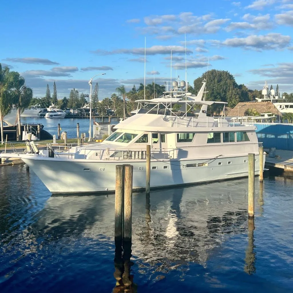 Introducing the 1989 Hatteras 65 Motor Yacht, a remarkable vessel that combines comfort and reliability. Quality construction and a Deep Vee hull design ensures a smooth and stable ride, perfect for both leisurely cruising and adventurous outings. Powered by twin Detroit Diesel 12V71TI engines, each delivering 870 horsepower, this yacht promises reliability on the water. Four stateroom interior with separate engine rooms, amidships VIP stateroom. Highlights include enclosed wheelhouse, lavish master suite, full width salon, enormous flybridge and a covered aft deck.