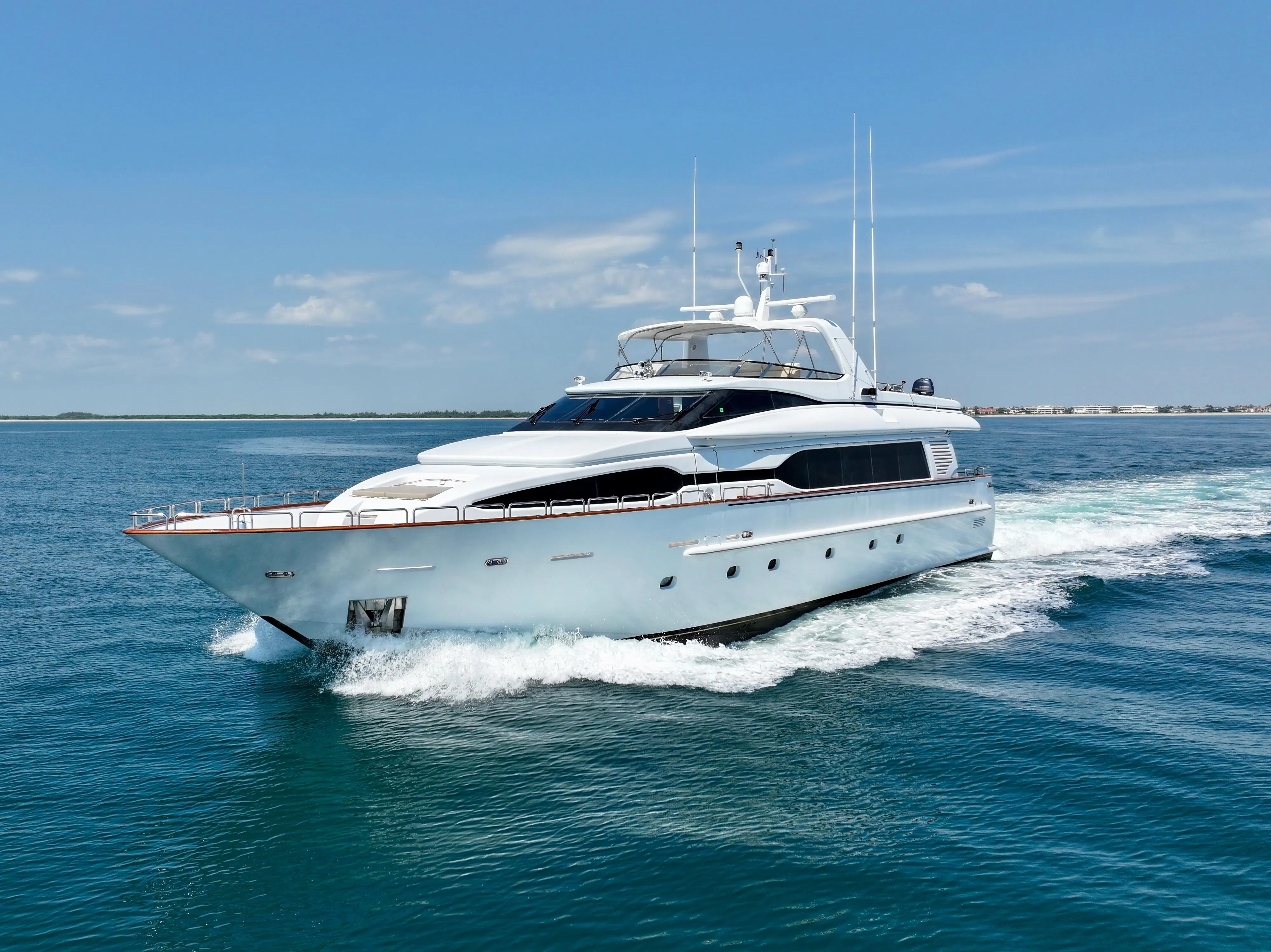 We proudly present “My Destiny,” an exquisite yacht with a timeless design featuring interiors by Evan K. Marshall. Measuring over 98 feet, this vessel combines sleek Italian aesthetics with unparalleled elegance, making her a standout on the water.