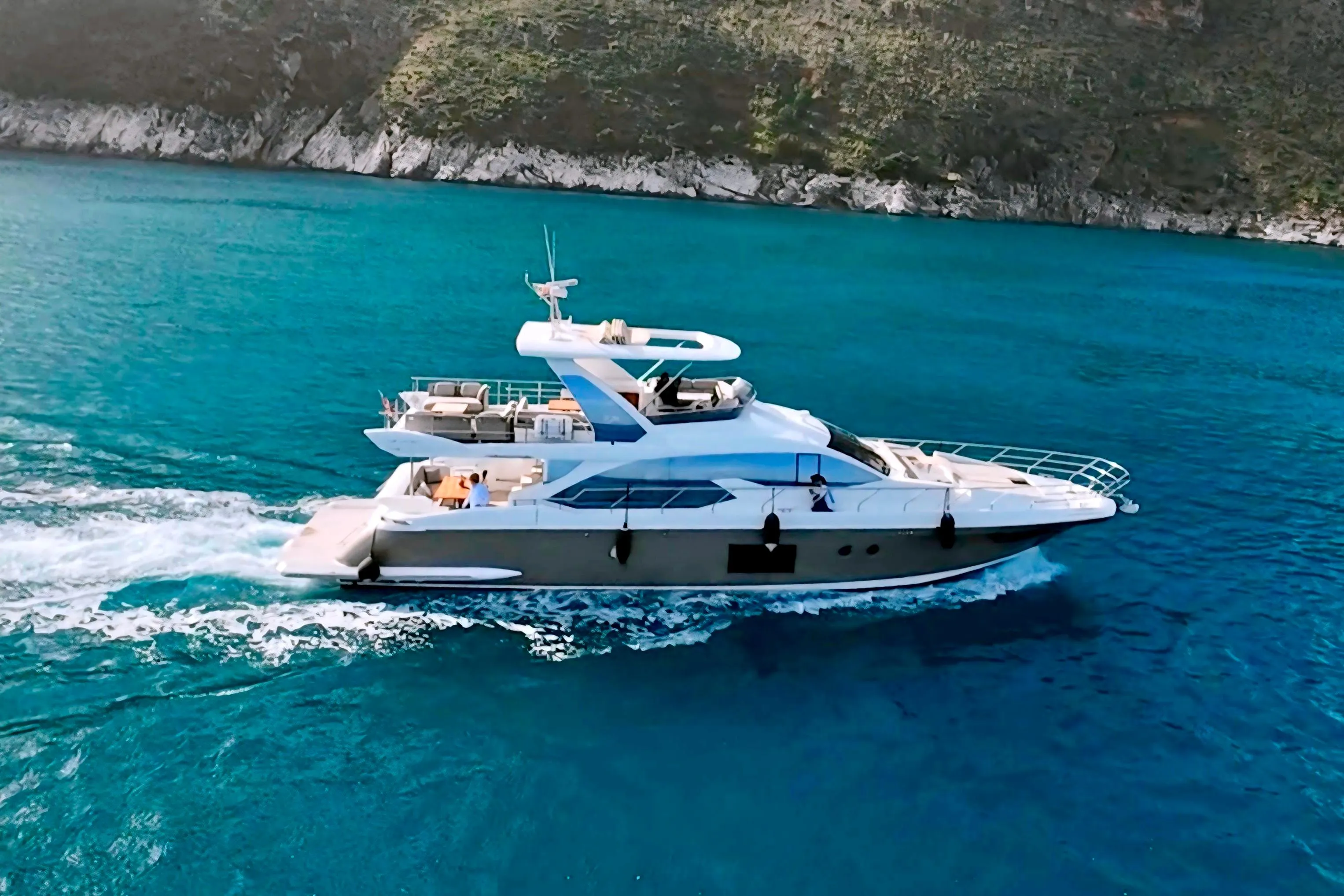 À l’extérieur, l’Azimut 66 est reconnu pour son flybridge d’environ 28 m², l’un des plus vastes de sa catégorie, conçu comme une véritable terrasse panoramique avec des espaces distincts dédiés au pilotage, au repas et au lounge. L’ensemble est complété par un wetbar / cuisine extérieure parfaitement dimensionné pour recevoir, avec zone de préparation, réfrigération et cuisson. Le teck présent sur le cockpit, la plateforme de bain et le flybridge renforce l’ADN “yacht lifestyle” de l’unité, tandis que les passavants et la proue en gelcoat antidérapant assurent une circulation pratique et sécurisée au quotidien.