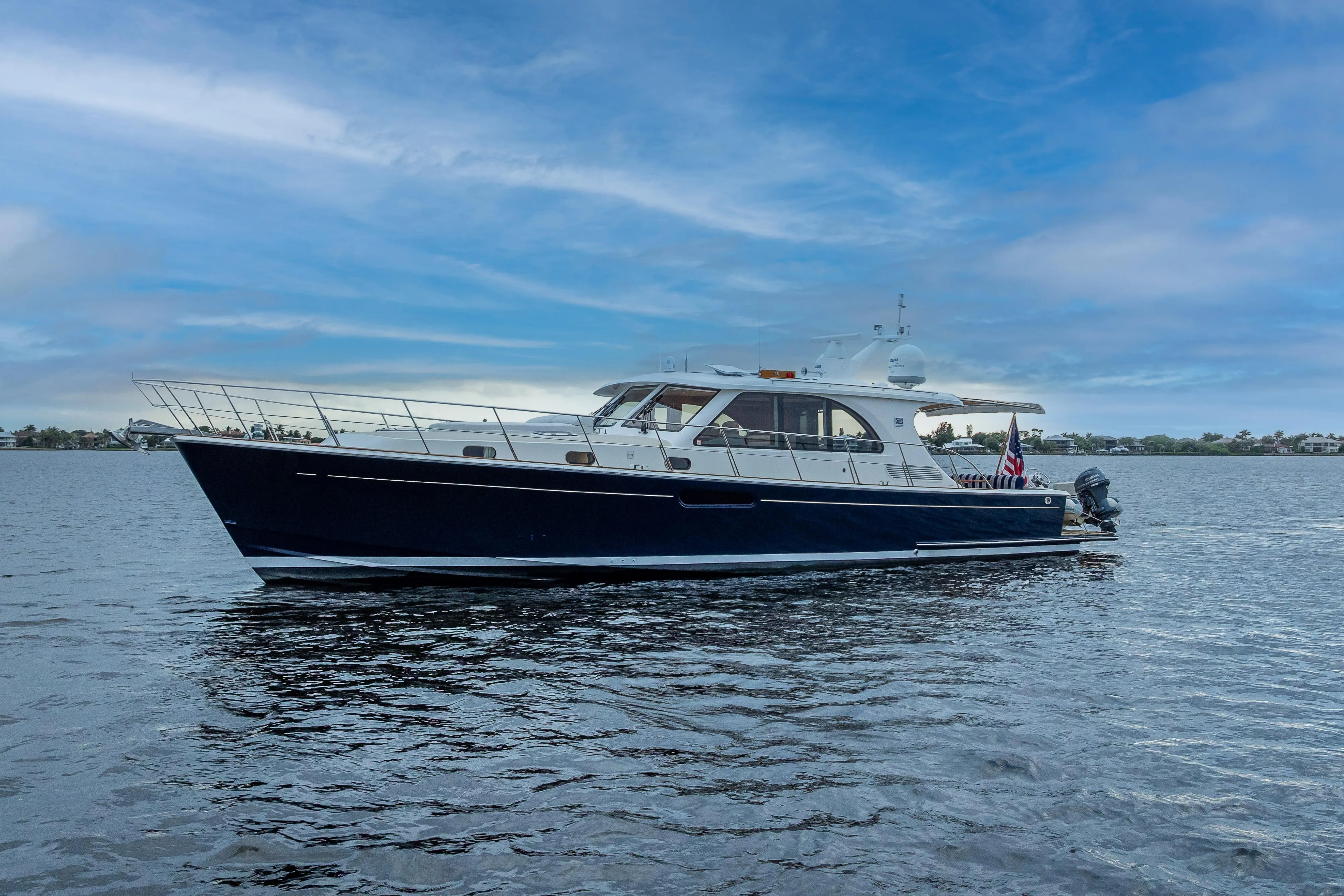 MYSTIQUE pairs timeless Eastbay styling with modern performance, thanks to twin Volvo IPS 900s with joystick docking and position hold capability. She is equally well-suited for owner-operators and experienced cruisers seeking confidence at the helm, easy maneuverability, and a refined onboard experience.