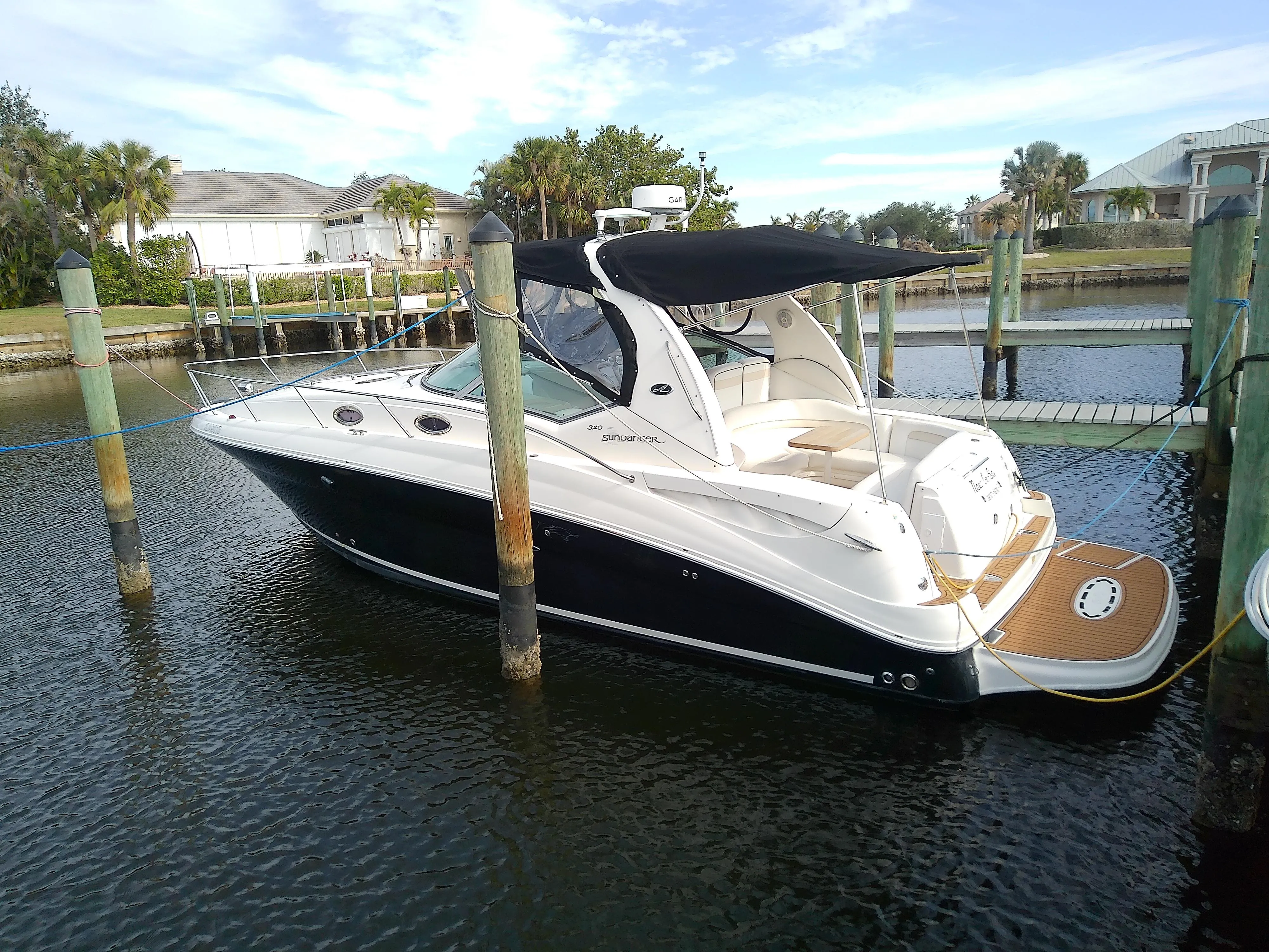 There's nothing quite like the exhilarating profile of this sleek 320 Sundancer. Its dramatic lines and bold colors make everything else look like it's sitting still. Exciting features include cockpit wet bar with Corian counter, extra-wide bench-style helm seating with two flip-up thigh-rise bolsters, optional underwater swim platform lighting, premium cabin surround sound, and lots more.