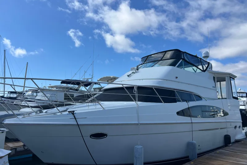 Welcome aboard this beautiful Carver 466 Motor Yacht that has been immaculately maintained. Whether relaxing on the aft deck or bridge, or entertaining guests in the surprisingly roomy salon, owners will enjoy the Carver 466 Motor Yacht. The generously sized bridge features a wraparound lounge with ample seating, plus an adjustable helm seat, two companion swivel chairs, and an ultra-stylish control console that provides abundant space for electronics. An integral stairway leads to the spacious aft deck where entertaining is a pleasure, with a hardtop that covers the entire deck, a skylight, a wet bar that includes bottle storage with ice maker, and a transom door that can be conveniently secured open or closed. Belowdecks, the salon is full beam and exceptionally large with beautiful hardwood floors. The striking decor and luxurious furnishings include an entertainment system with HDTV, Sony stereo w/Bose sorround sound speakers, an UltraLeather lounge with incliners, and a solid-surface snack bar. Elegant cherry wood cabinetry and trim adds a dash of extra style. Three staterooms and two head compartments deliver privacy and comfort for everyone. Fresh Buff/Wax September 2025. New AC water pump installed Oct 2025; 2 New AGM start batteries installed October 2025.