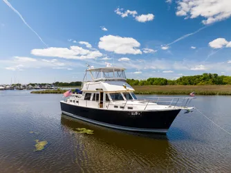 NELLIE is a well-maintained 47 Sabreline 1998 Trawler with an eye-catching blue hull and white gelcoat topside. Inside, it offers a cozy yet spacious layout featuring two staterooms, two heads, an inviting salon, a U-shaped galley, and an updated lower helm station. Powered by twin 435-horsepower Caterpillar 3208TA engines, NELLIE ensures reliable performance, complemented by a 12 kW Northern Lights generator and a Xantrex 3000-watt inverter for convenience on the go. On deck, enjoy wide walkaround side decks, a large cockpit and swim platform for water activities, and a flybridge with fiberglass hardtop. Having successfully completed the Great Loop, NELLIE is ready for new adventures, appealing to both seasoned voyagers and novice cruisers alike.