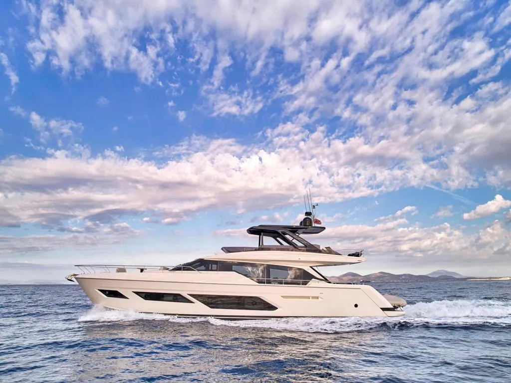 The 72 Ferretti Flybridge motor yacht is a luxurious Italian-made vessel designed for both performance and comfort on the water. Built by Ferretti Yachts, a brand renowned for its craftsmanship, elegance and innovation, this model offers a blend of modern design, spacious interiors and high-end amenities.