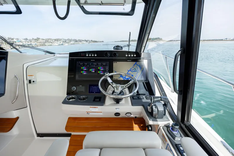 • Mercury DTS dual binnacle controls with integrated engine trim controls (single remote ignition key switch in cabin with pushbutton start/stop located at the helm) (Mercury SmartCraft Vessel View 5" color LCD Display) (network connections to Raymarine Navigation Package)