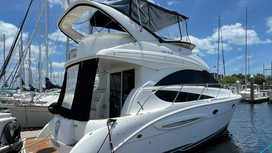 2007 35 Meridian Sedan Bridge for sale. Please take a look at this hard-to-find 2007 341 Meridian Sedan Bridge. The 341 Meridian redefines just how much cruising comfort you can design into a compact sedan by providing extra features and comfort you need for extended cruises. Her impressive accommodations include a very inviting salon with large plush sofa seating, large pane tinted glass windows for natural light, and 360 degrees views. Moving forward is a full galley, two spacious staterooms for four, and an extra-large head with an enclosed shower. This 341 Meridian is nicely matched with Twin 320HP 6.2L Mercury Inboards with a closed cooling system - 600 Hours - Kohler 7.3kw Generator.