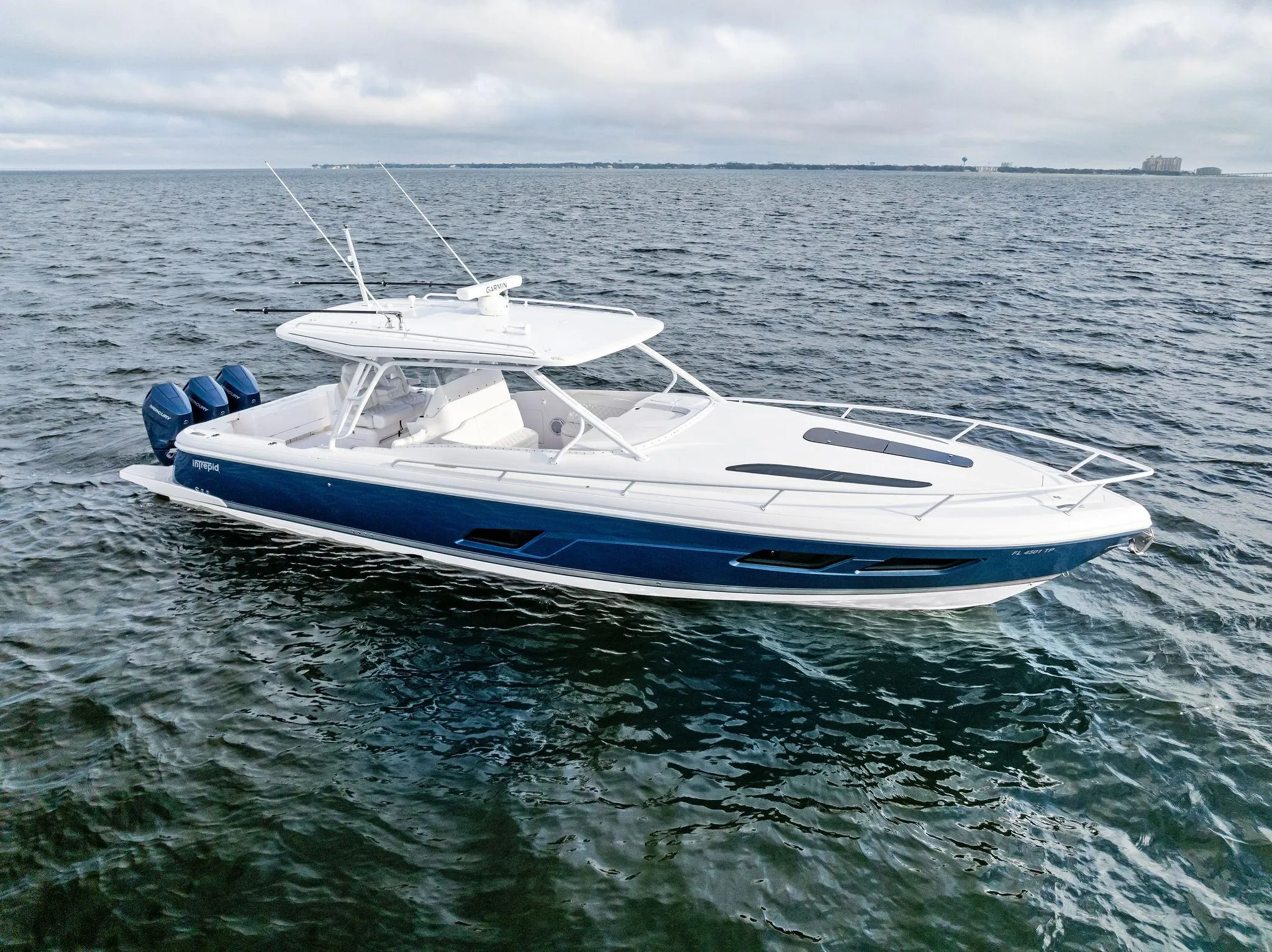 2023 41' Intrepid 41 Valor is a high-performance center console designed for both offshore performance and comfort. Powered by triple Mercury 400 V10 outboards and sporting a deep-V hull design, this vessel ensures a smooth, precise, and fast ride… even in rough waters. The expansive deck space and versatile layout offer generous room for up to 12 passengers, ensuring a luxurious experience underway. The forward cuddy cabin is elegantly appointed with teak flooring and a comfortable double berth, while the convertible dinette effortlessly transforms into an additional berth at the touch of a button. With cutting-edge features like joystick control, integrated Garmin electronics, and a custom aesthetics package, this Valor 41 seamlessly combines advanced technology with practical luxury. The boat has a large lithium battery bank to efficiently power the A/C and house systems ensuring extended comfort on your long trips. This platform is ideal for serious anglers who dream of offshore excursions or families who want to cruise for long-range rendezvous, with an emphasis on being above deck. This Intrepid 41 Valor is built to deliver exceptional performance, comfort, and durability no matter where your adventure takes you.