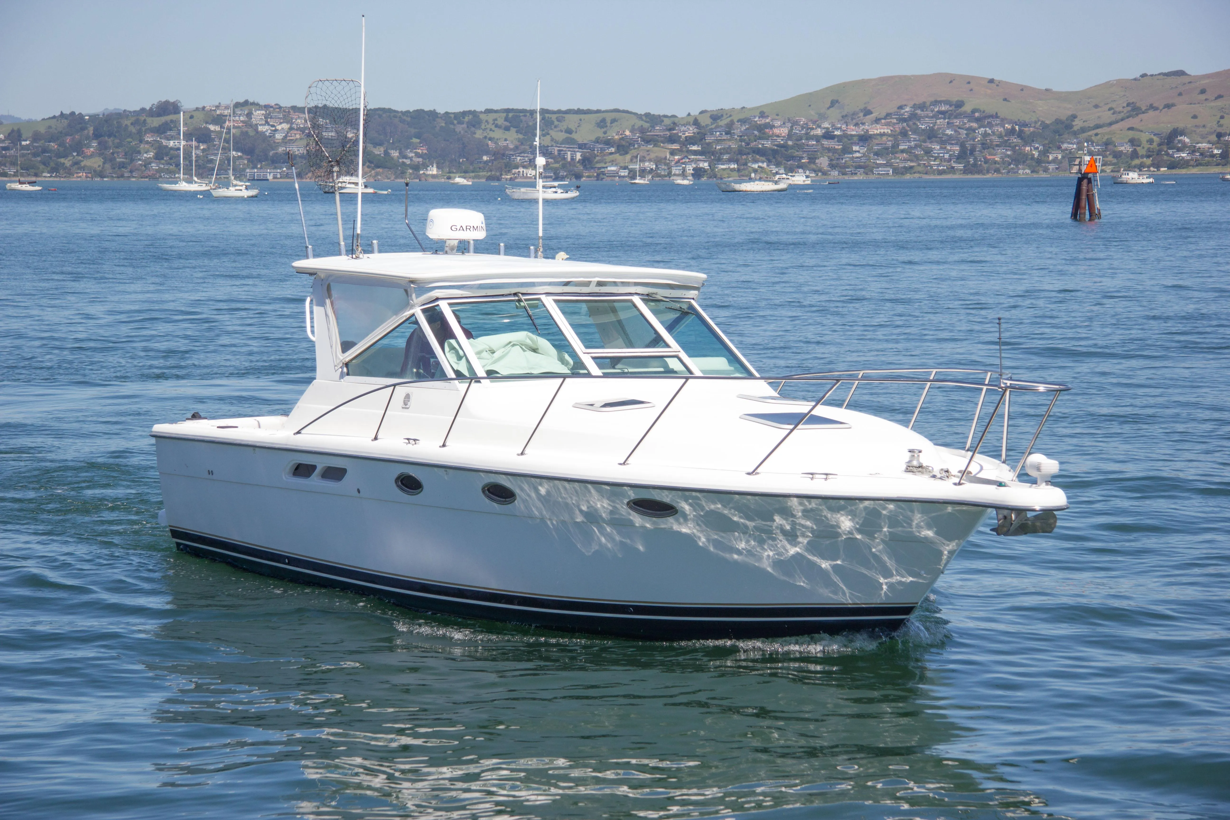 Introduced in 1992, the made-in-America Tiara 3100 Open is a complete update of the original 3100 and features a reworked solid fiberglass deep V hull with sharper entry and additional transom deadrise (and 2,000 pounds greater displacement) for stability, and greater bow flare for a drier ride. Below, the interior of the new 3100 has a bit more headroom than her predecessor, and there’s also a bigger U-shaped dinette. Additional updates included more fuel, a tilt-away helm console, a transom door, recessed trim tabs and prop pockets to reduce shaft angle.