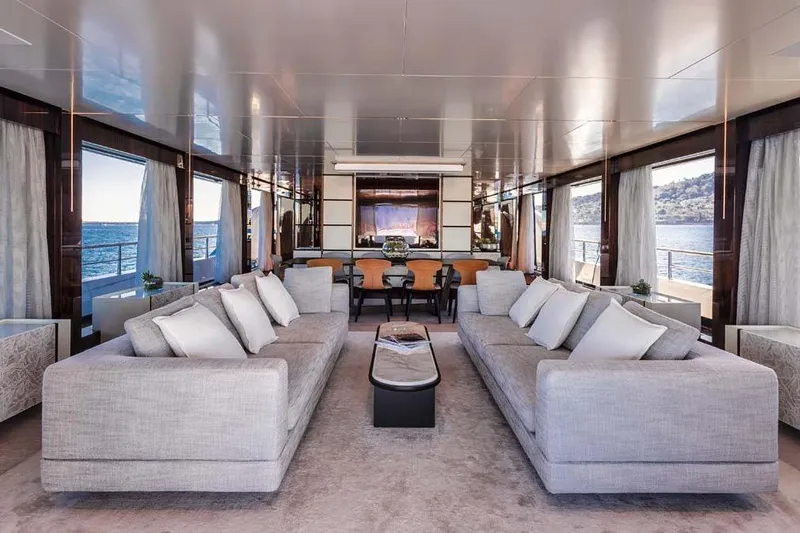 When one walks forward across the large aft deck, one will reach a pair of glass electric double doors giving access to a spacious and well-appointed open layout salon, comfortable seating, and formal dining forward of the salon. The salon and dining area have floor-to-ceiling windows offering a light and airy feel throughout. From here, one can go forward to port to find a guest day head. Further forward and amidship, one will find a corridor giving access to the galley and pilothouse. Back in the dining area, one can go forward to starboard to find a stairwell to lower guest accommodations or up to the private Owner’s deck.