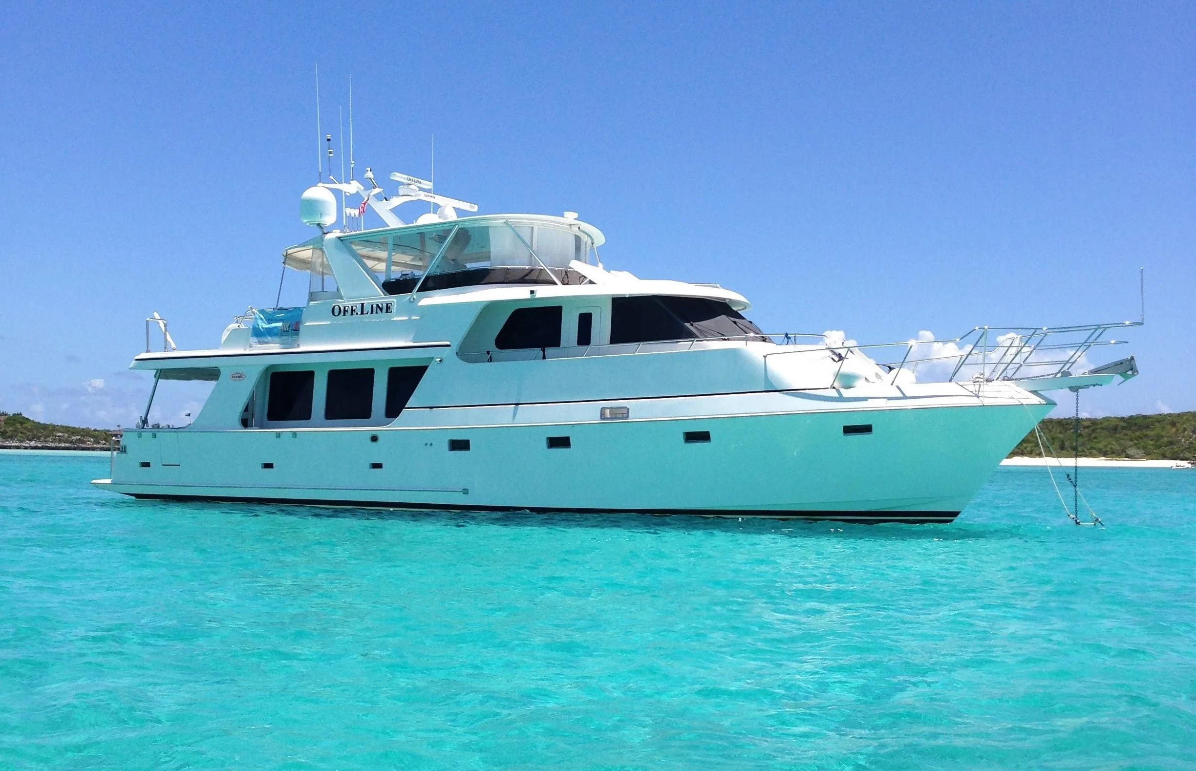 2007 Symbol 59 Pilothouse Motoryacht "OFF LINE" is a major player in the luxury yacht and motoryacht area, Symbol has come to represent serious design excellence and engineering ability. Every Symbol Yacht delivered has been extensively quality checked making it one of the most seaworthy and quality brands on the market. Beautifully finished interior in satin cherry wood with burl countertop accents and teak and holly floors in pilothouse and galley. Very functional layout with excellent access features stern and side gate boarding, wide covered walk-around side decks, port & starboard pilothouse doors and Portuguese bridge walk-around in front of pilothouse with access to foredeck.