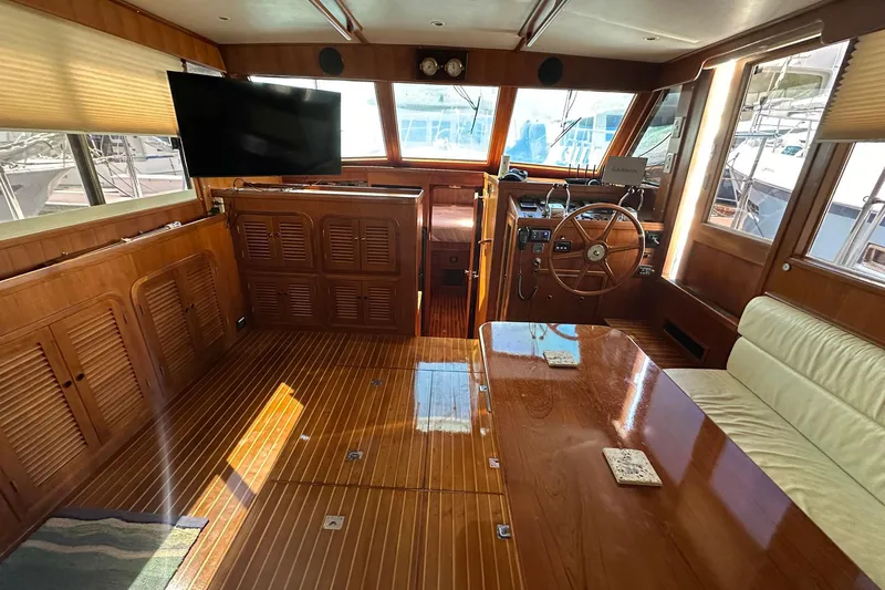 Entering OFF RAMP from the starboard salon door you notice the lower helm station with a full array of navigation equipment and gauges. The salon interior is highlighted by solid Teak cabinetry and paneling creating a warm and traditional atmosphere. The salon is bright and airy with large windows providing natural light.