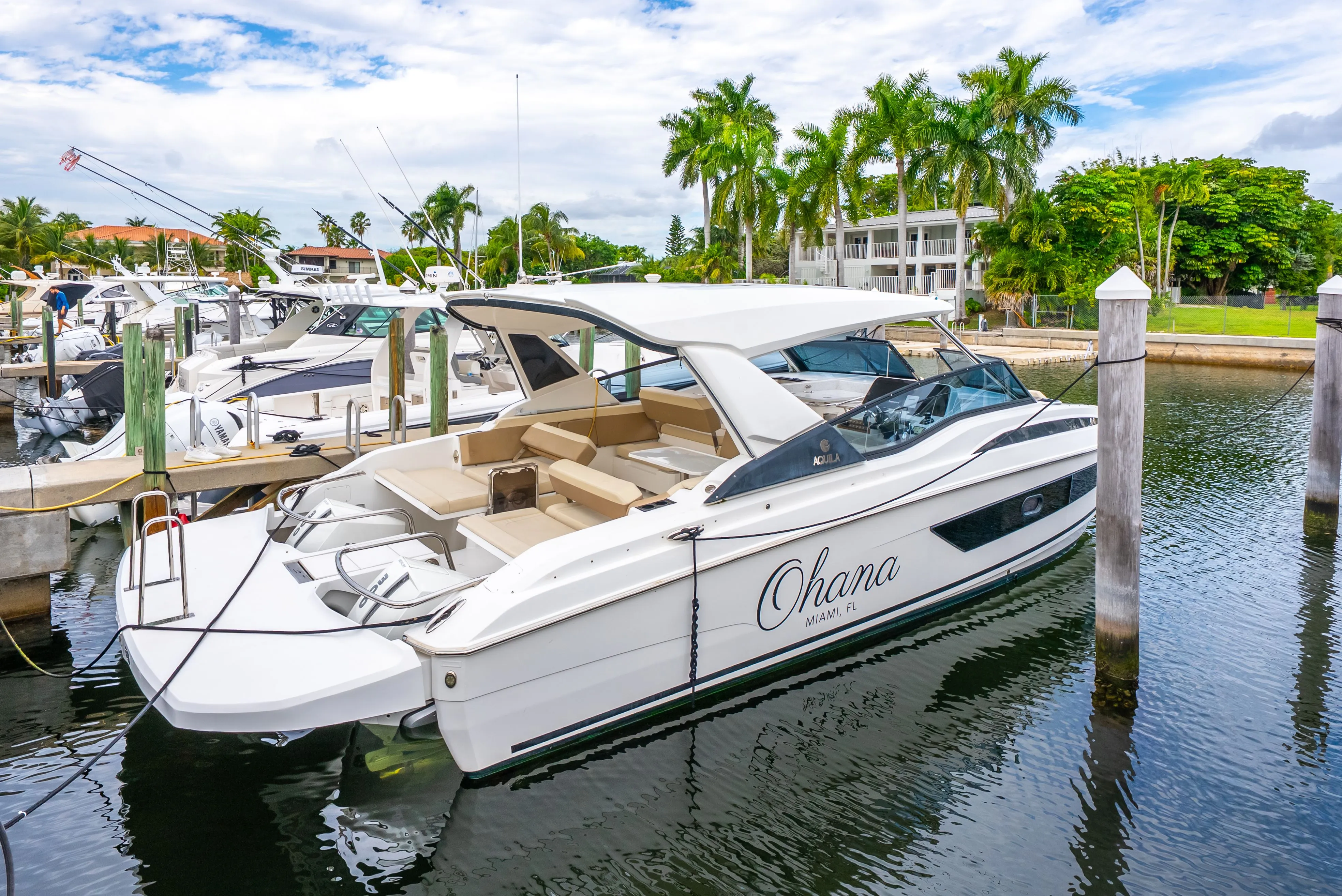 This 2020 Aquila 32 has everything you are looking for with all the key options available on this model! Aquilas are known for their quality of design, amazing ride and innovation. Whether you are spending the day at the sandbar, heading to your favorite restaurant or making the crossing to Bimini, this Aquila will offer a great ride, comfort for you and the family and all the options for a great day on the water. The 12'8" beam provides stability and plenty of space to bring the family and friends on the water. The upgraded twin Mercury V8 Mercury 300HP engines with joystick get you a top speed of 40 knots and let you cruise at 27 knots. This boat wont last so call now for a showing at its Deering Bay location!