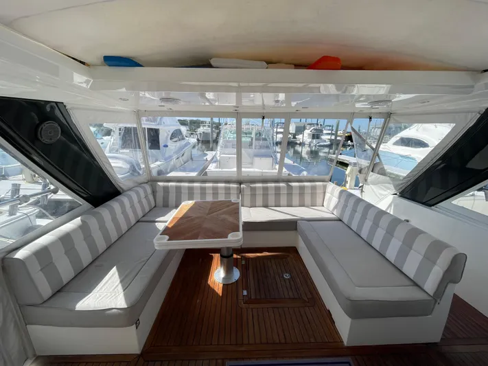 One of the most significant design features of the S450 is the cockpit layout which makes maximum use of the full beam width of the boat for seating and entertaining. There are four wide forward facing seats at the helm, a fully integrated dashboard, plus a wet bar behind the seats. To the rear the flexible seating and dining arrangement offers comfortable dining for 8. This space can easily be transformed into rear or forward facing sunbathing areas with optional hi lo private bathing platform.