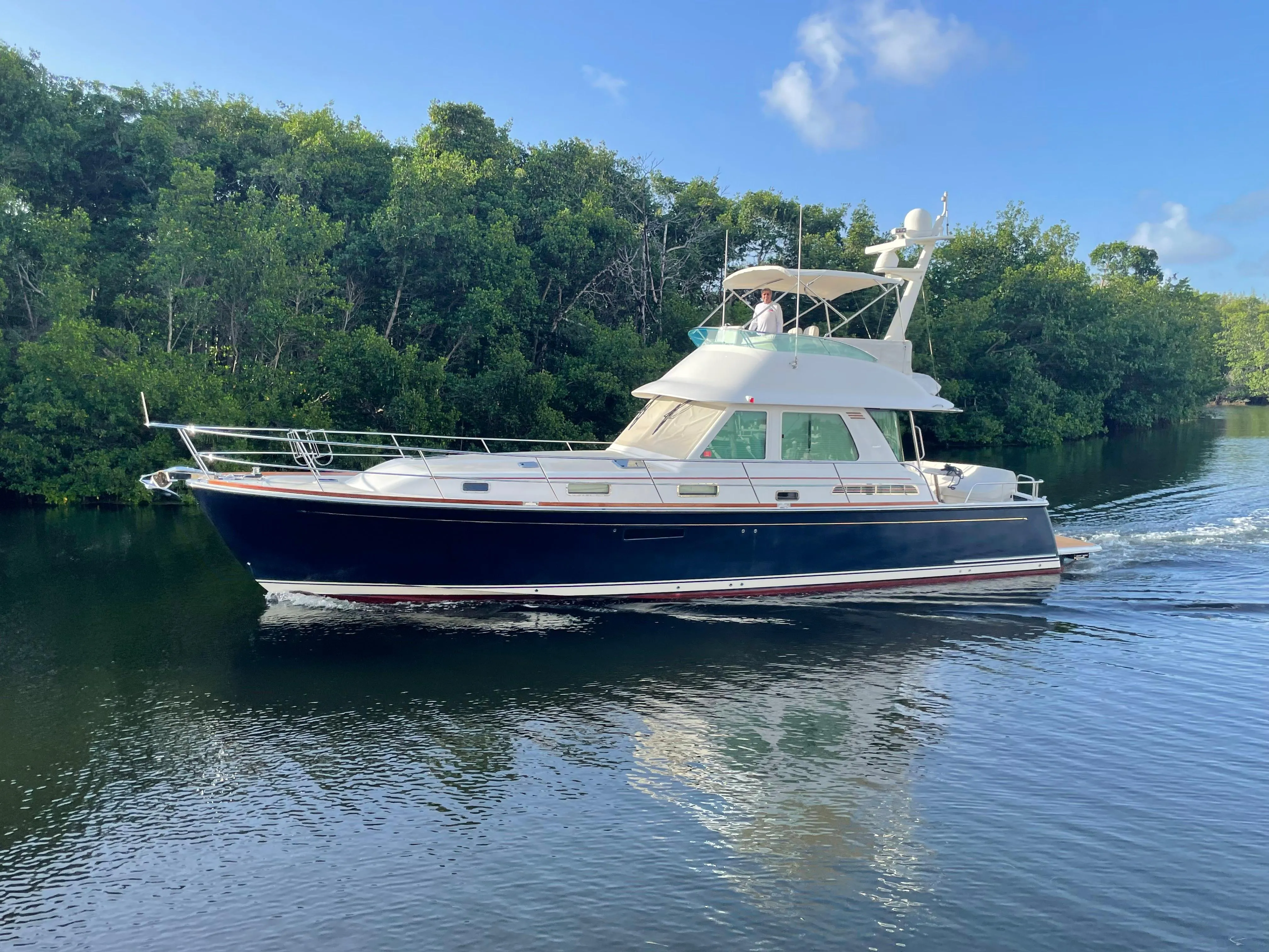 A comfortable, safe and sea worthy American Built Yacht. Two large staterooms with ensuite heads plus a Third Stateroom when needed (forward of the engine room) Amenities including a washer/dryer, electric sunshade, teak cockpit, Freedom Lift, Joy stick control, skyhook, etc...all make for Ideal Family Cruising. The Condition of the Vessel is in an word..."Amazing"