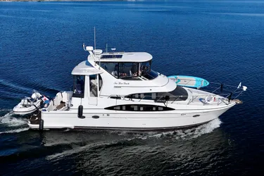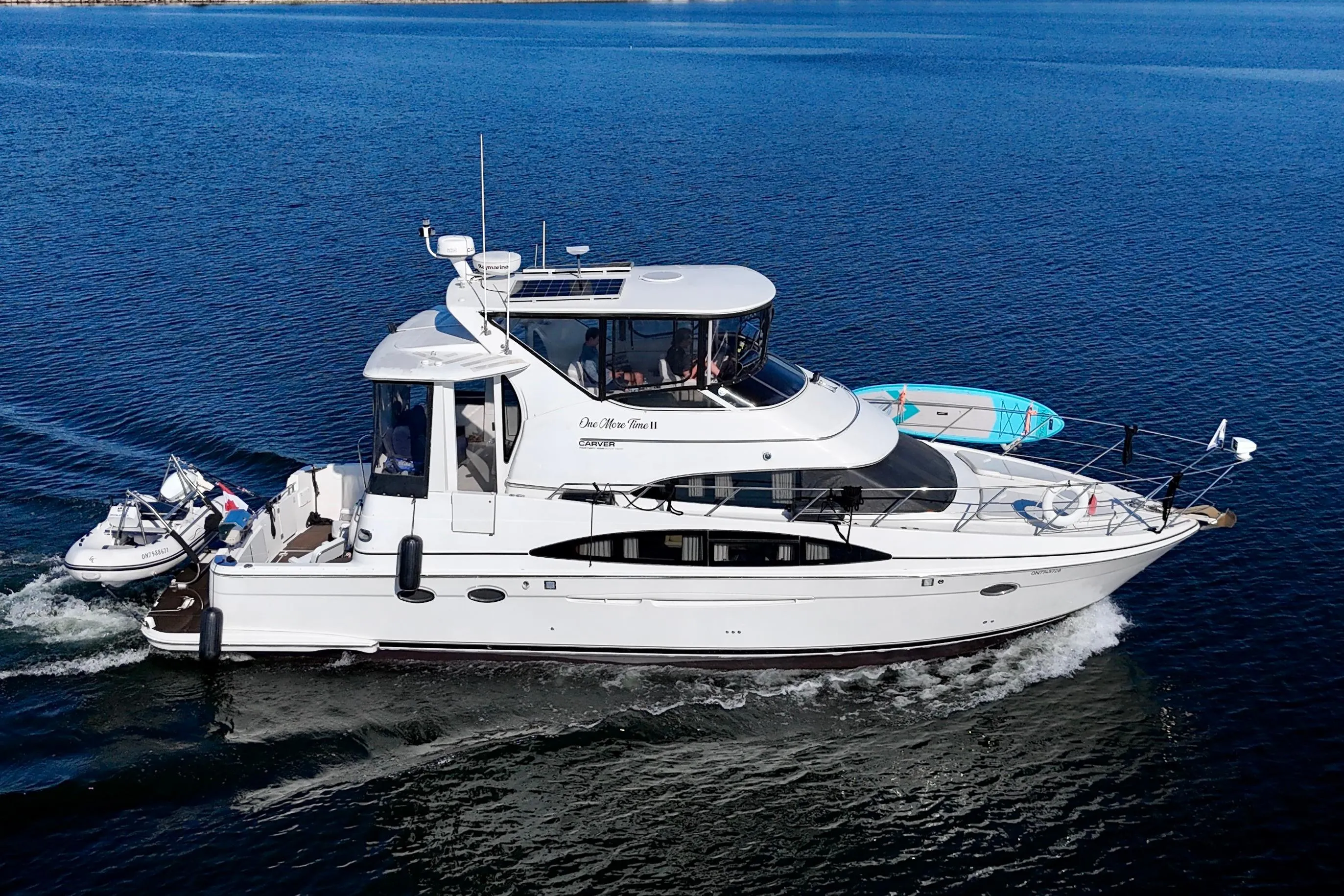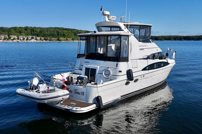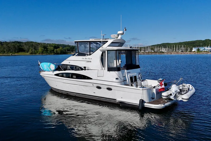 A 2004 Carver 444 CPMY featuring a hardtop and Volvo Penta power. The 444 has a great layout with plenty and makes an excellent floating cottage. The vessel has three different levels for easy boarding for various dock heights. The large platform and cockpit give plenty of outdoor space, with molded steps to bridge and a sliding door entrance to the main cabin. A fully enclosed bridge cockpit, and bridge with a hardtop provide plenty of seating. The salon is expansive with plenty of natural light, the galley and dinette blend in to give you a truly grand feel. Forward is the guest cabin with en-suite head. To aft you have a large stateroom with walk-around queen bed, and en-suite head with separate shower. This boat has been set up for cruising the Great Lakes with dinghy caddy, solar, lithium, and an inverter.