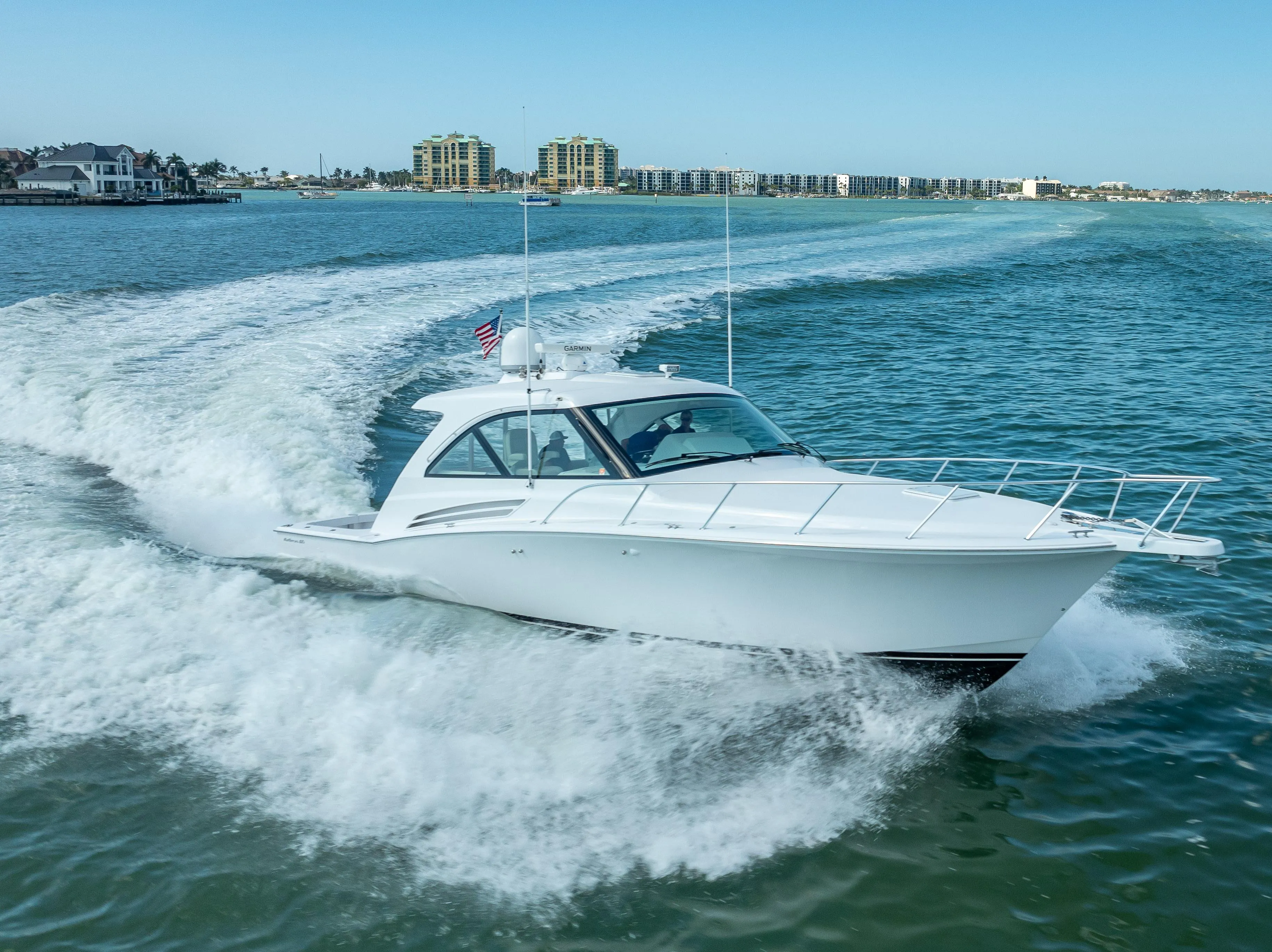 The 45s distinctive style shines through with its sleek exterior, spacious cockpit, and a meticulously crafted interior that prioritizes both comfort and functionality. The expansive aft seating and cockpit are ideal for daytime socializing, while the integrated electric grill makes entertaining effortless. When the sun sets, unwind in the open-concept cabin and galley, with thoughtfully designed overnight accommodations that promise comfort and relaxation.