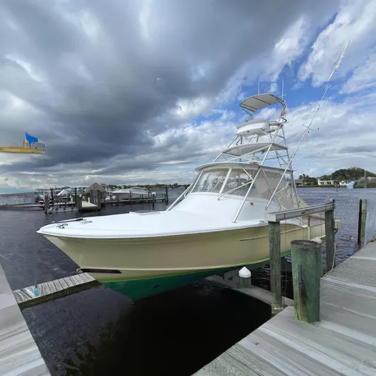 Don't miss out on this cold-molded Carolina express sportfish with a single Cummins 540hp QSC designed by Jesse Rhodes. Built in Charleston, SC by Dixon Boatworks, there is centerline helm pod with a Stidd helm chair, hardtop above has flush mount pancake teaser reels, and a recently new G&G enclosure. The OSPREY has been boatlift kept and has a modest but useful, air-conditioned cabin below with enclosed head/shower, galley, and V-berth with filler panels, plus an Onan generator. She will make an economical 27mph cruise and the bow thruster makes handling around the dock easy. Tower has controls and there are recently fresh belly band and bench seat cushions. A pair of spreader outriggers and a center rigger and rod holders on the aft hardtop and rear tower legs, plus a transom fish box and a livewell behind the helm seat. Aft facing, cushioned bench seat is just to starboard of the helm. The 4-blade prop is in a pocket on her bottom allowing shallow water comfortable 3'3" draft. Inside there is a V-berth forward with overhead hatch and two filler sections to make a full berth when wanted with a digital thermostat for the A/C on the side. A mini-galley has microwave oven, sink, and refrigerator with modest cabinets and a small settee across on the portside.