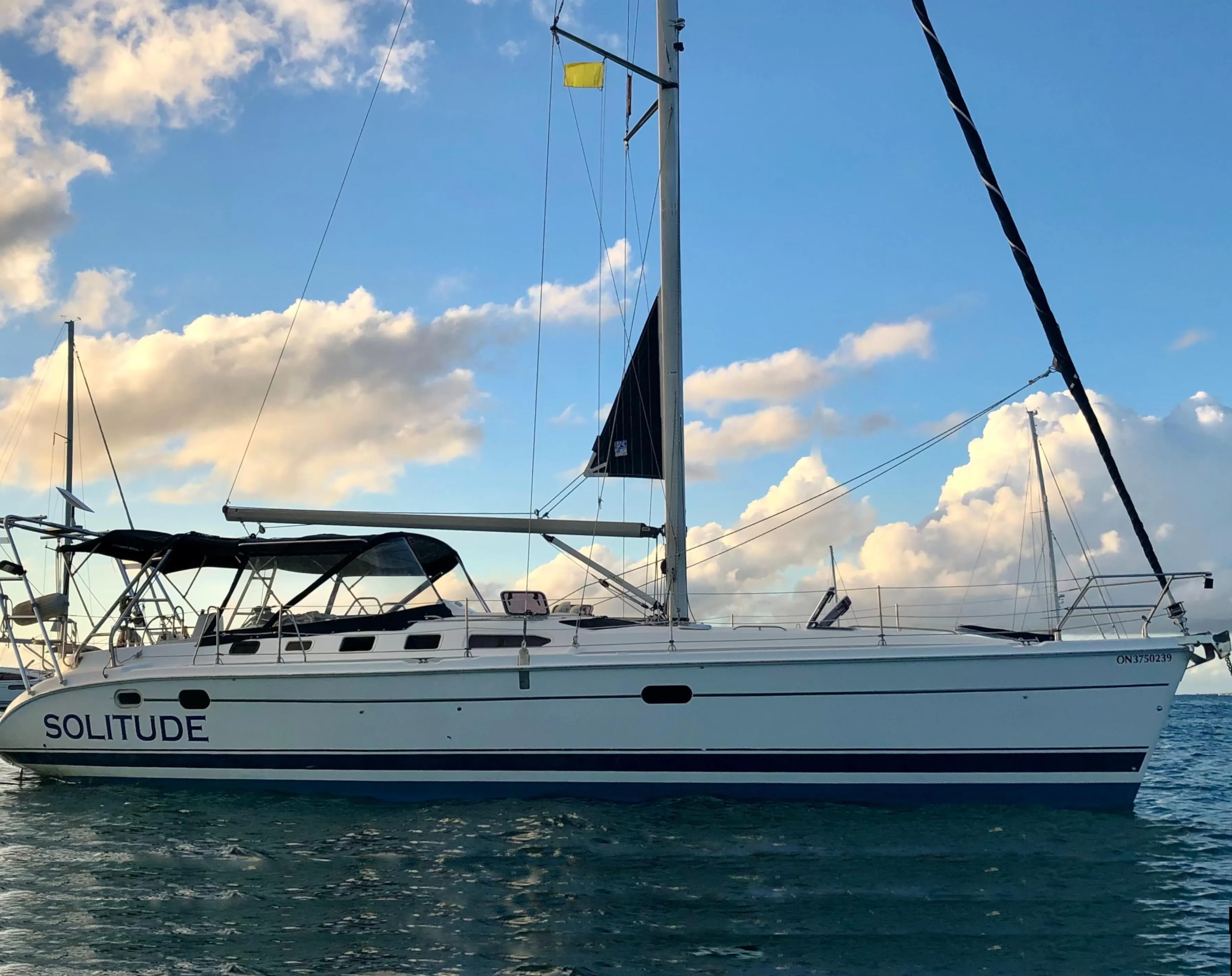 Versatility best describes the Hunter 466. Whether your intention is to liveaboard, cross the bays or the oceans, Our Solitude is up to the task. The sleek hull form is powered by an easy to handle B & R rig with a large furled main and furled jib. With all lines leading aft and a stainless arch with mounted traveler, this rig is safe and a breeze to handle with just two aboard. Sailing solo is also very doable. The aft cockpit offers great visibility, plenty of storage and a custom console that houses your electronics. The walk-through transom allows for easy boarding and fast line handling. Our Solitude is durable yet beautifully crafted. The salon is open and airy and includes a spacious dinette, seating for 8. The forward master has an ensuite head and separate shower. The 2nd cabin has a private access to the second head for additional privacy. The third cabin is also airy with lots of storage and hanging locker. A fine finish enhances the warm, teak furniture and bulkheads with new upholstery both inside and the cockpit.