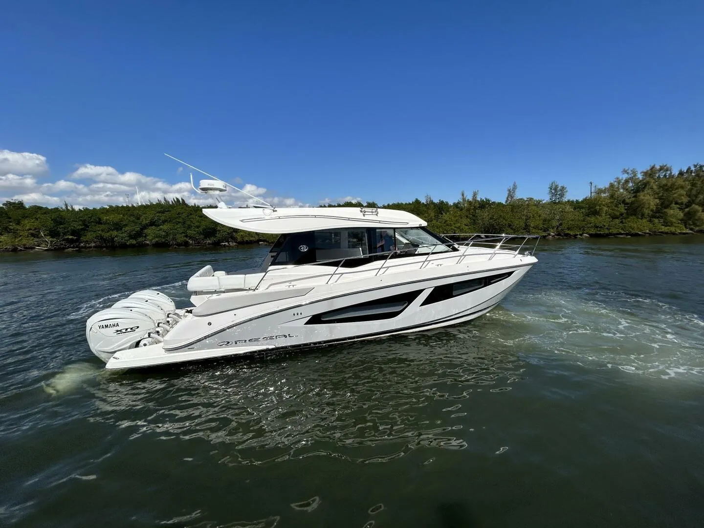 Open up new horizons with the Regal 42 XO. Relax in beautifully crafted cabins and enjoy a spacious layout. The standard en-suite head, crafted with premium materials, includes a separate walk-in shower. Upstairs, the full-beam retractable hardtop, opening side windows and sliding glass doors merge the upper salon and aft patio seamlessly, so everyone on board can enjoy outdoor living and entertaining together.