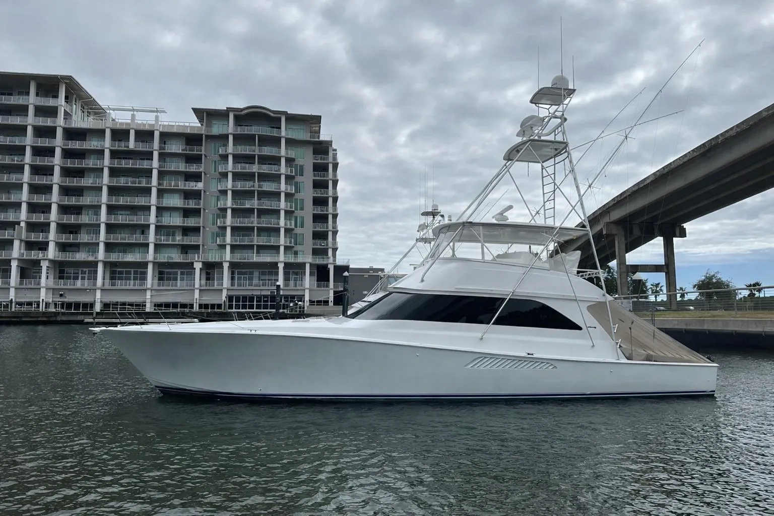 Here is the stunning 2002 Viking 61 Convertible "OUTA LINE", a splendid example of a used Sportfish convertible boat that combines elegance with performance.