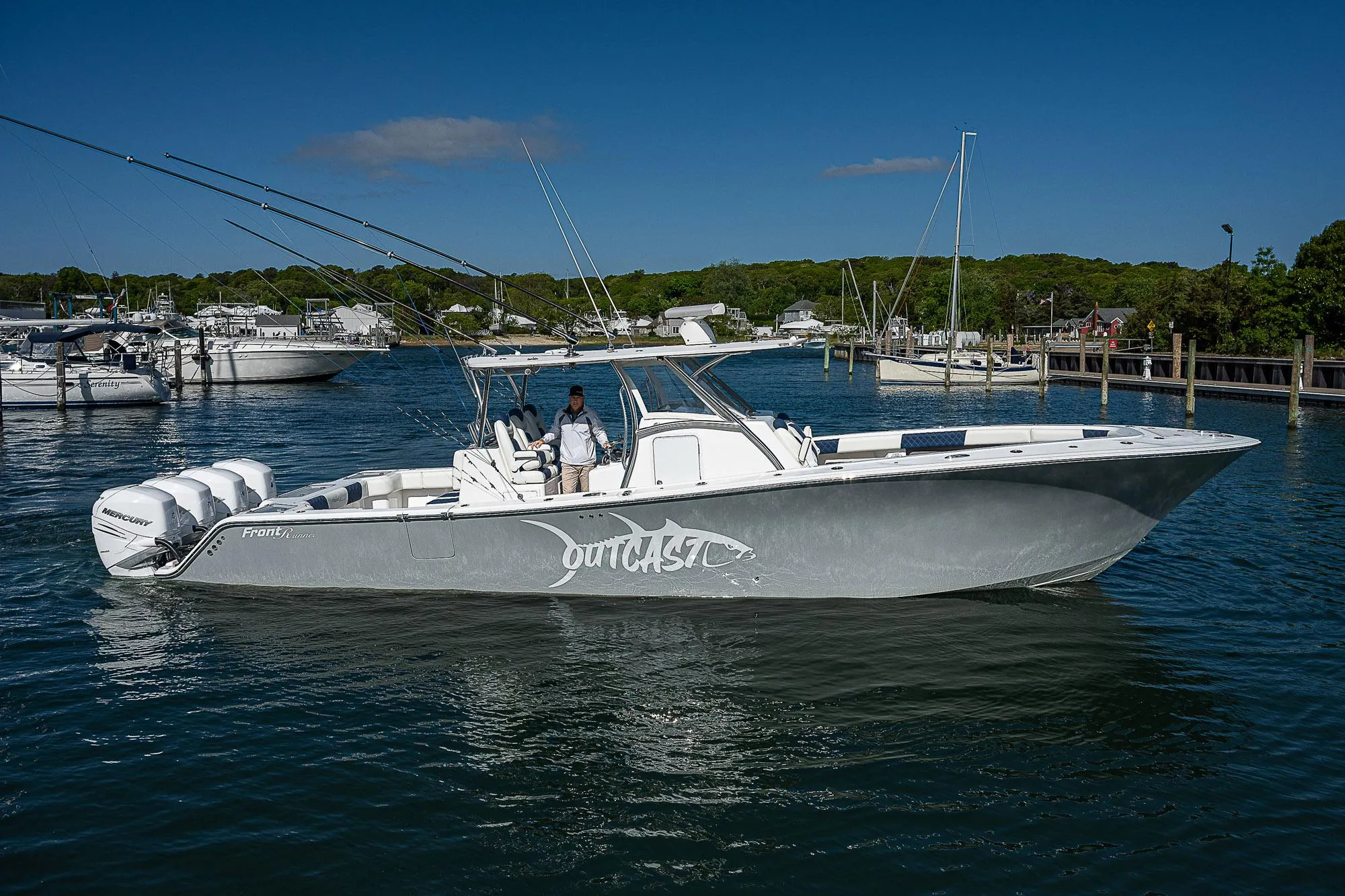 The Front Runner 39 CC is hands down one of the best riding center consoles in her class. “OUTCAST” is a lightly used 39 CC powered by quad Mercury 400’s with low hours and optioned with joystick maneuverability. Some notable features include Garmin electronics, dive door, underwater lights, upgraded JL audio system, triple helm seats, matching rocket launcher, Gemlux carbon fiber outriggers, SeaDek, cockpit screen, slide out Frigid Rigid cooler, insulated sun lounge, tackle center, transom rod rack, Kingfish rod holders and much more. If you haven’t experienced the ride of a Front Runner you’re missing out.