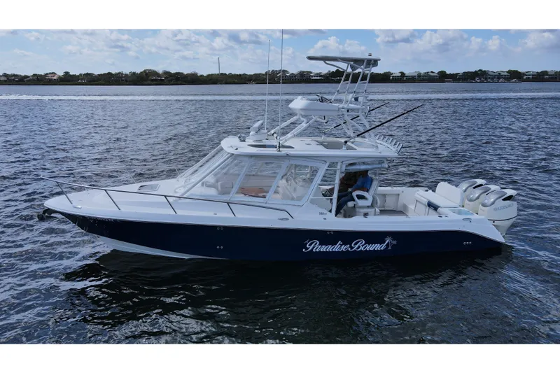 At approximately 35 feet in length with a beam around 10 ft 8 in, the 350LX provides a large, stable platform with a modified-V fiberglass hull designed to cut through offshore chop while maintaining efficiency and stability at speed. The boat carries triple Suzuki outboard engines, providing strong acceleration, high cruising speeds around 25–30 knots, and top speeds approaching 45 knots depending on power configuration. With a large fuel capacity of roughly 328 gallons, the vessel is capable of extended offshore runs and long-range fishing trips.