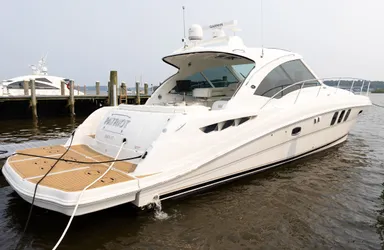Cruise in the low 20s with 540hp Cummins V-drive diesels 28-29 knots top. The gorgeous curves and aerodynamic profile of the 48 Sea Ray Sundancer are sure to attract attention. Outfitted with a unique, electric windshield vent system that allows for an unbroken line from deck to roof plus a sleek hardtop with two large hatches.